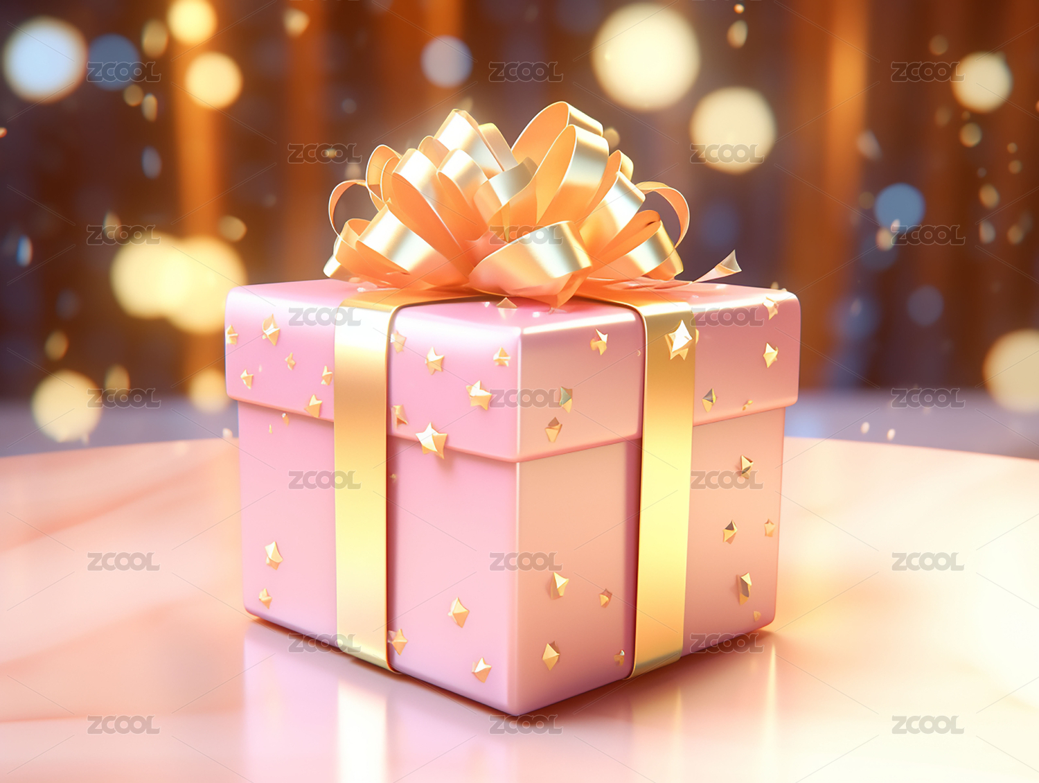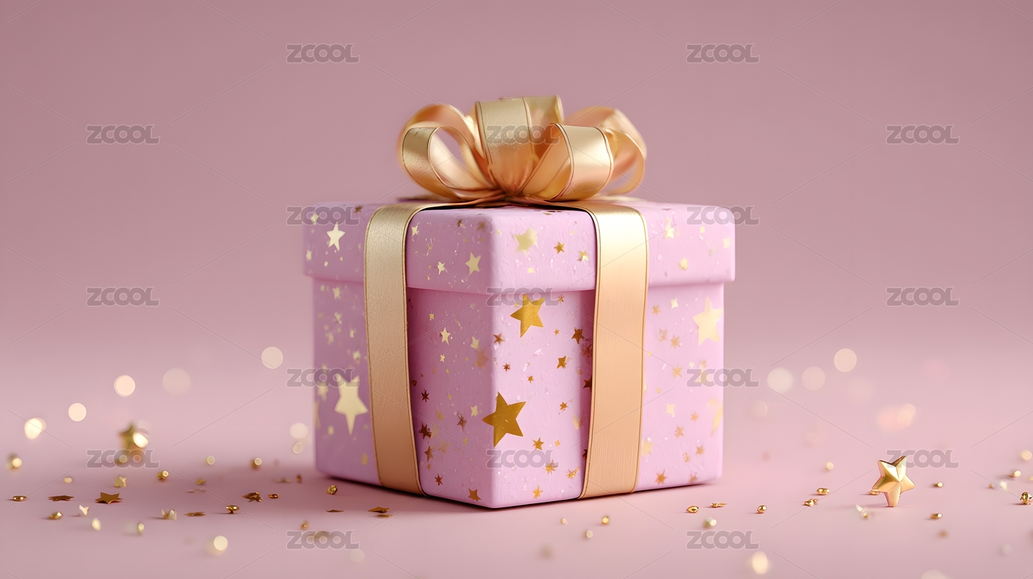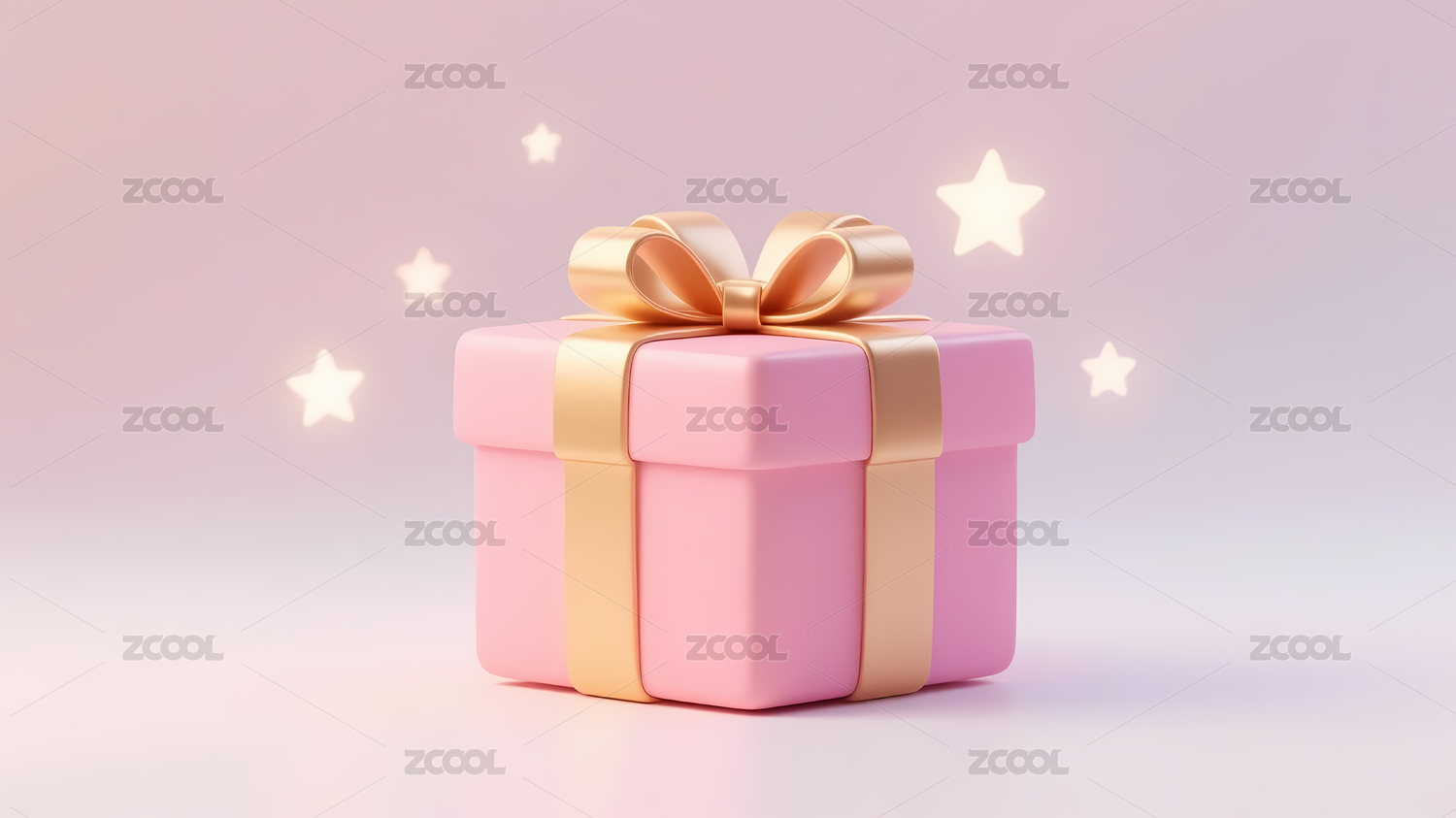 粉色礼物盒,3D渲染,金色丝带,蝴蝶结,梦幻背景,星光效果,节日气氛,温馨浪漫,庆祝,祝福