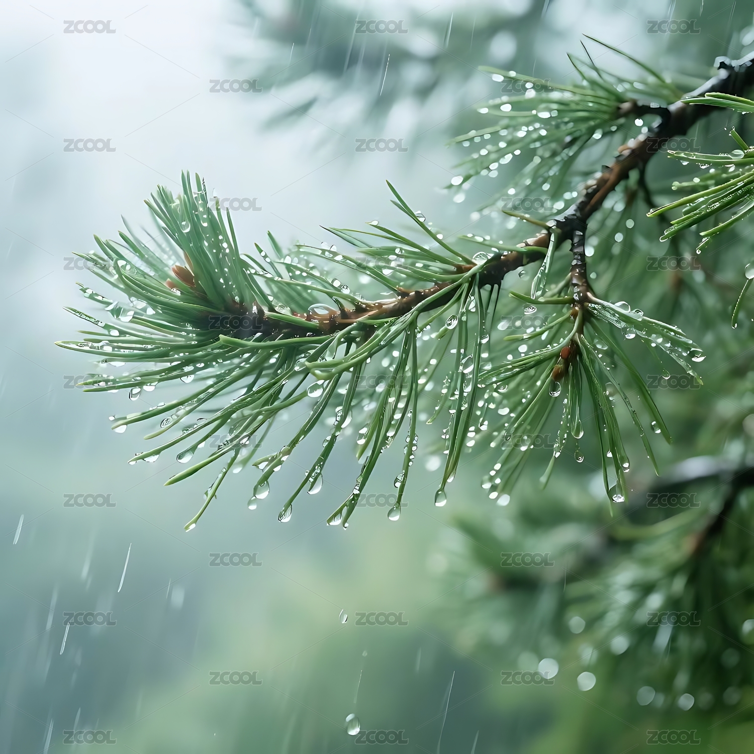 青翠的柏树叶在风中摇曳,雨滴落在叶面上