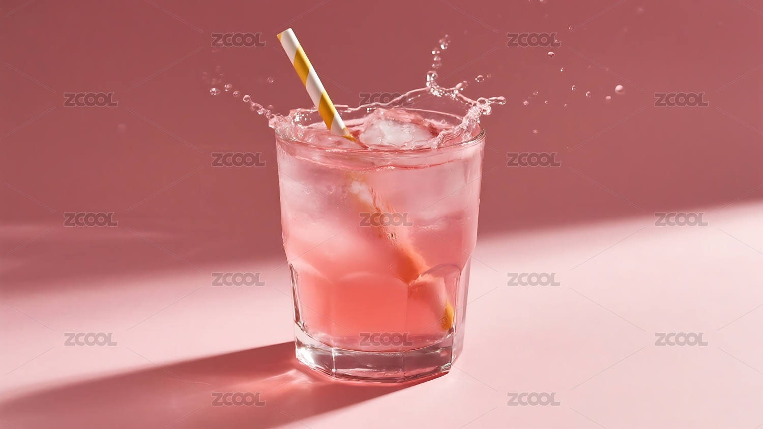 浅粉色背景上一杯装有草莓的气泡水和冰块