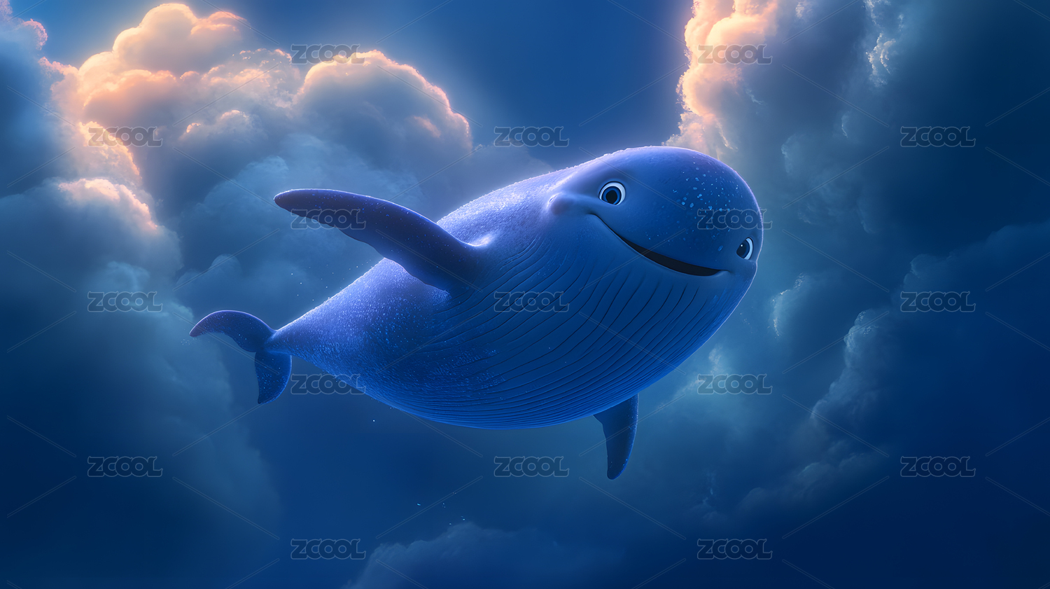 一只可爱的蓝鲸优雅地漂浮在梦幻的天空中