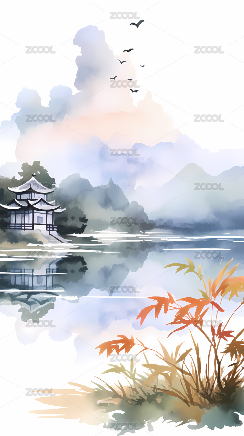 中国水墨画风格江南山水秋天春天拱桥亭子