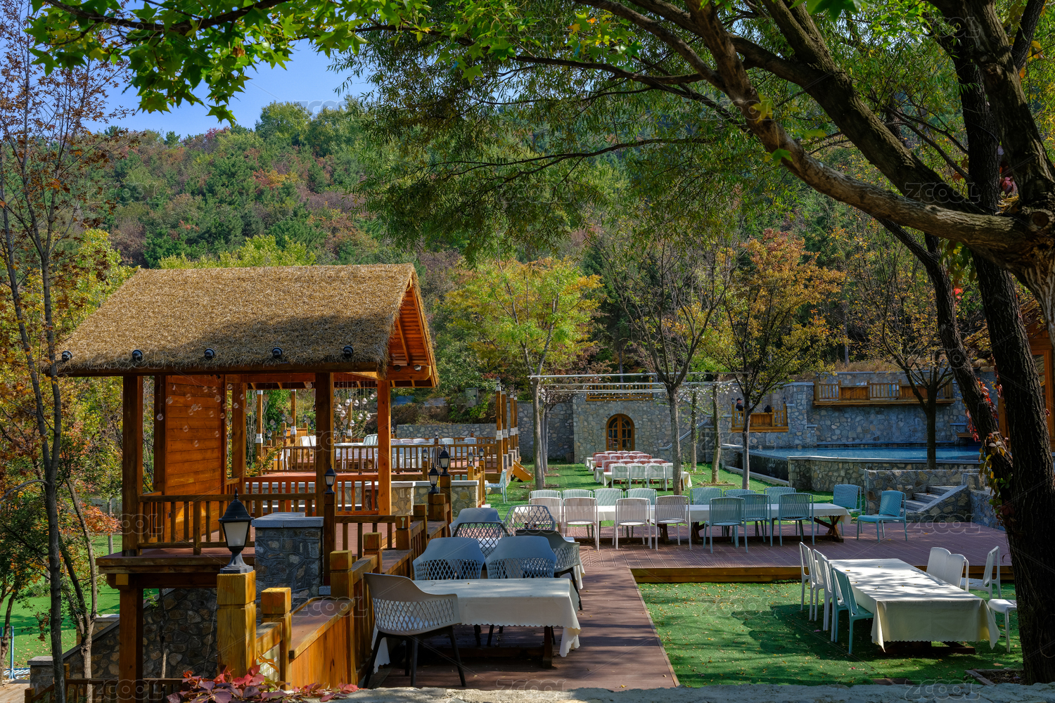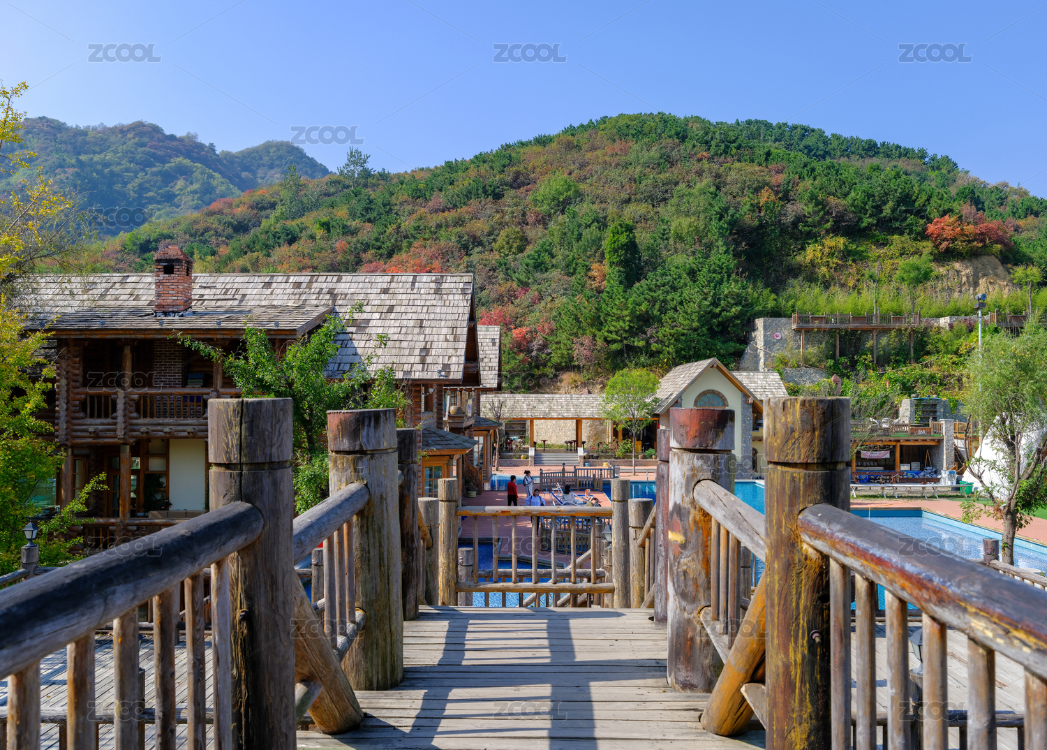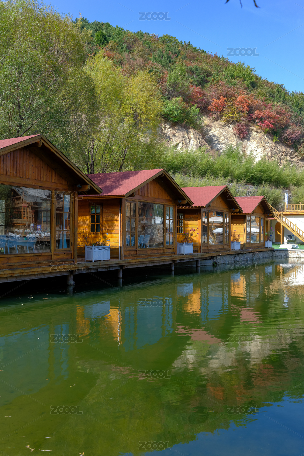 九如山,木屋,湖畔木屋,木质建筑,户外露台,桌椅,绿树,山林,湖水,休闲场所