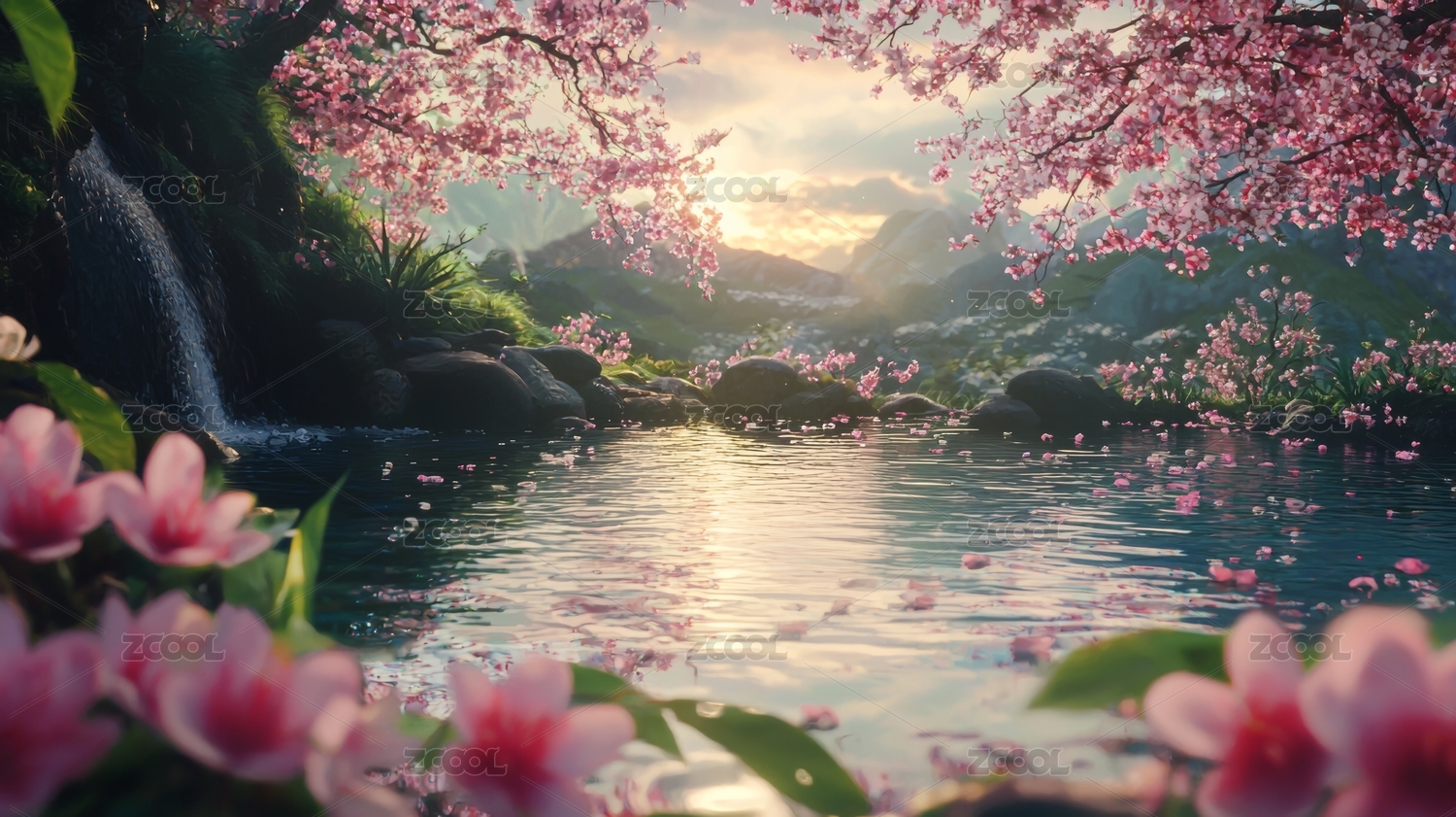 樱花瀑布仙境湖泊景色