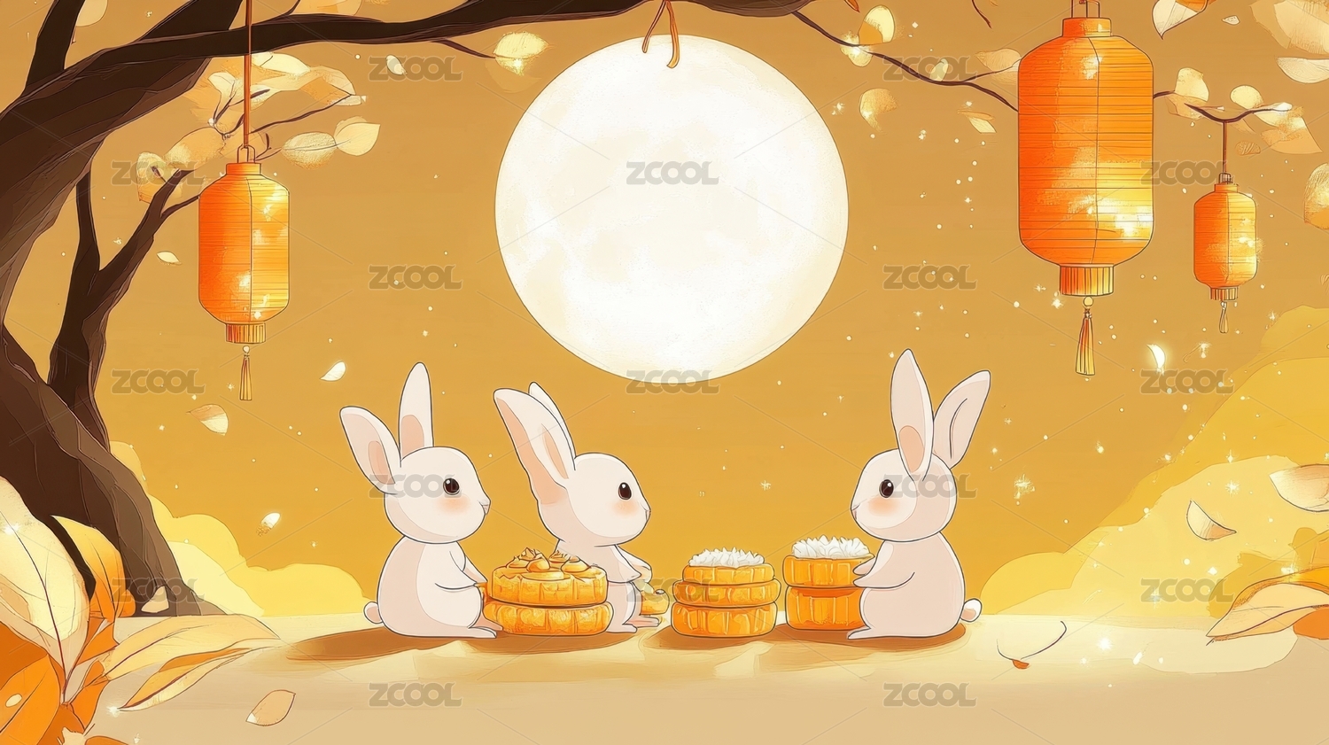 中秋节玉兔赏月吃月饼兔子望月传统节日插画