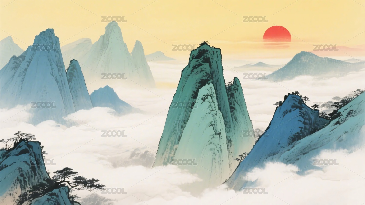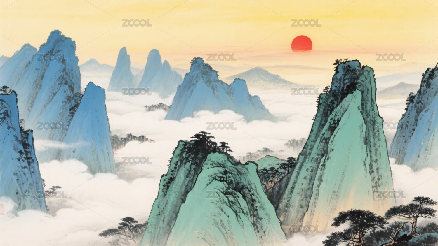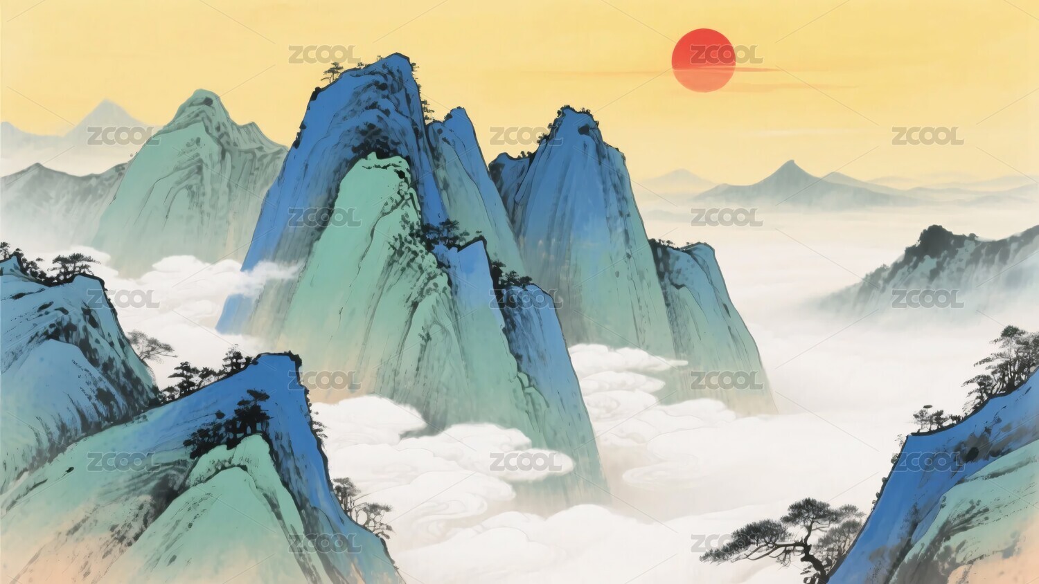 山水,落日,云雾,山峰,河流,插画,自然,景色,景观,国风