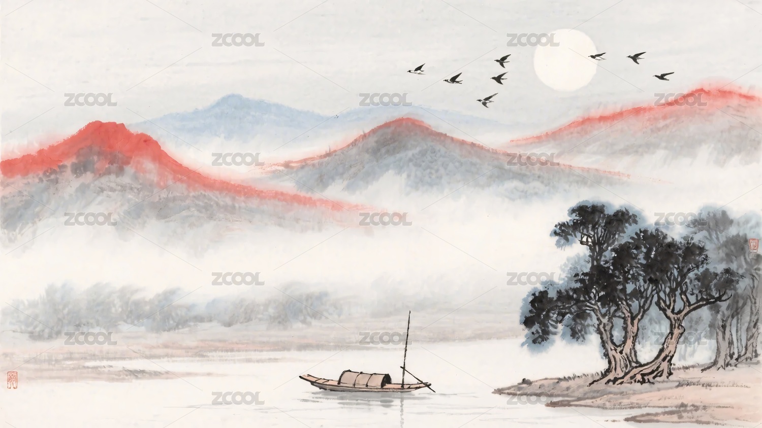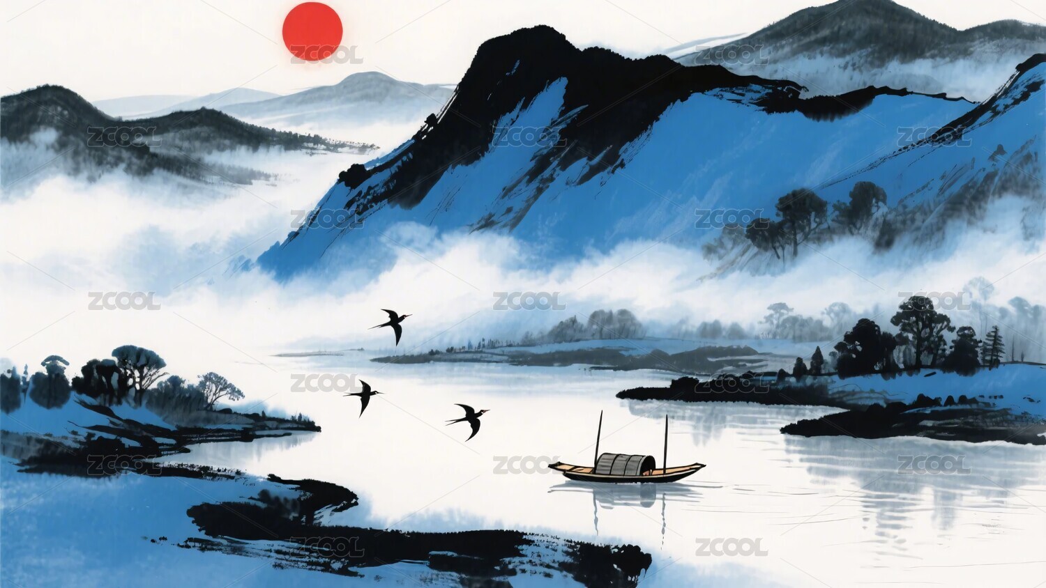 山水,落日,飞鸟,小船,插画,中式,风景,意境,水墨,自然