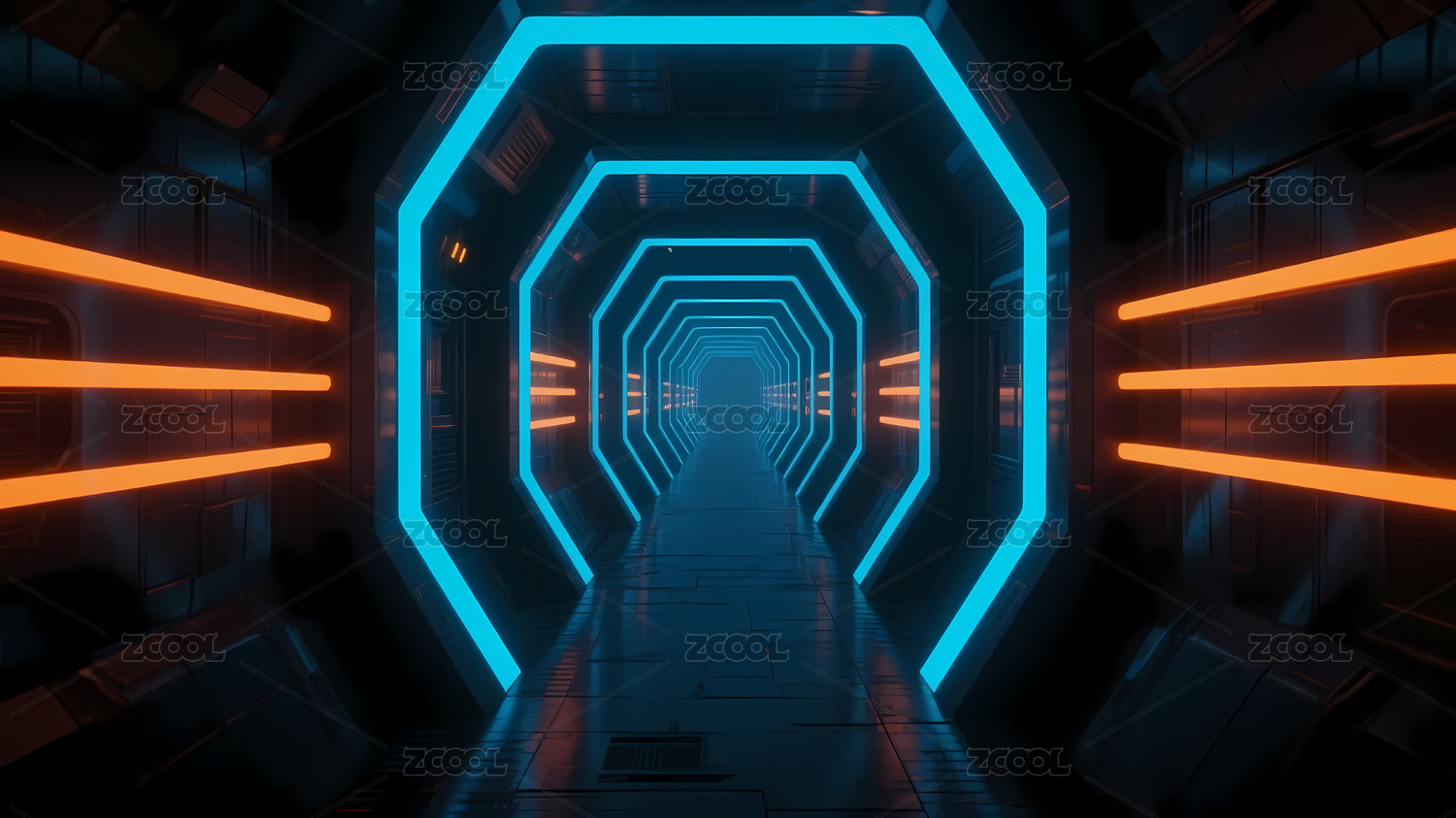 蓝色,橙色,深色,未来,六边形,结构,隧道,霓虹灯,空间,几何