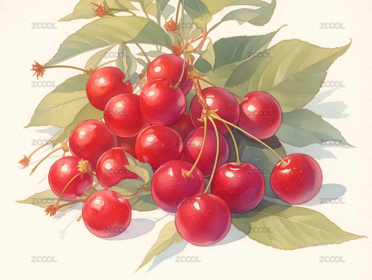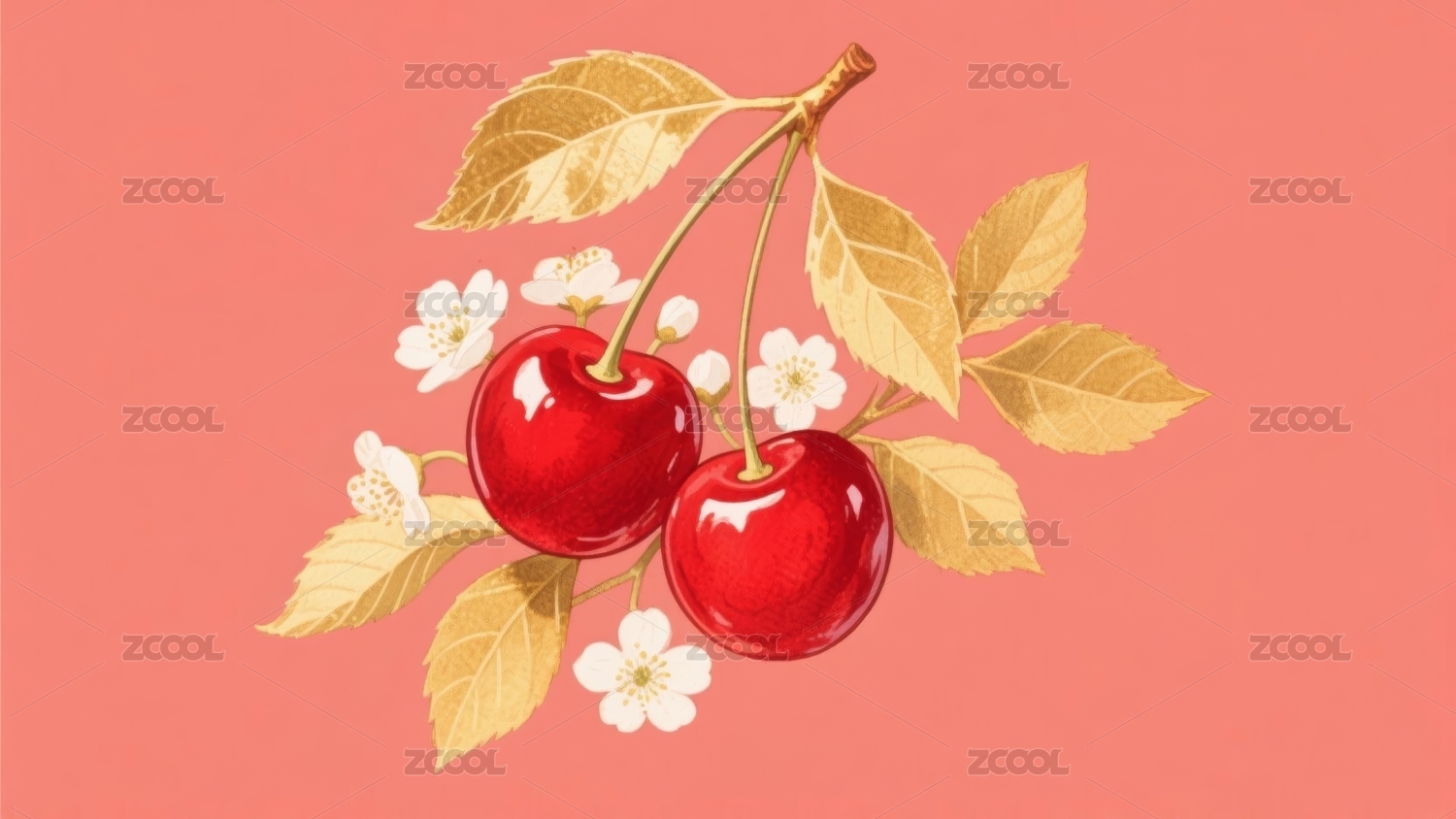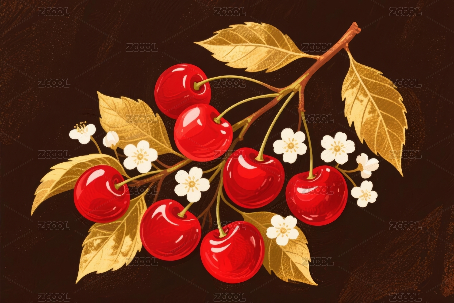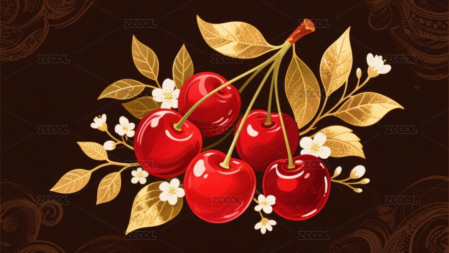 主视觉,场景,金叶,樱桃,插画,水果,金色,叶片,艺术,设计