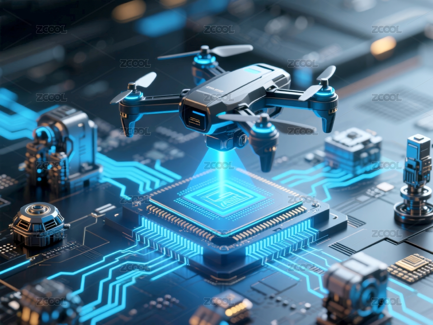 主视觉,场景,无人机,包裹,科技感,物流,芯片,电路,发光,配送