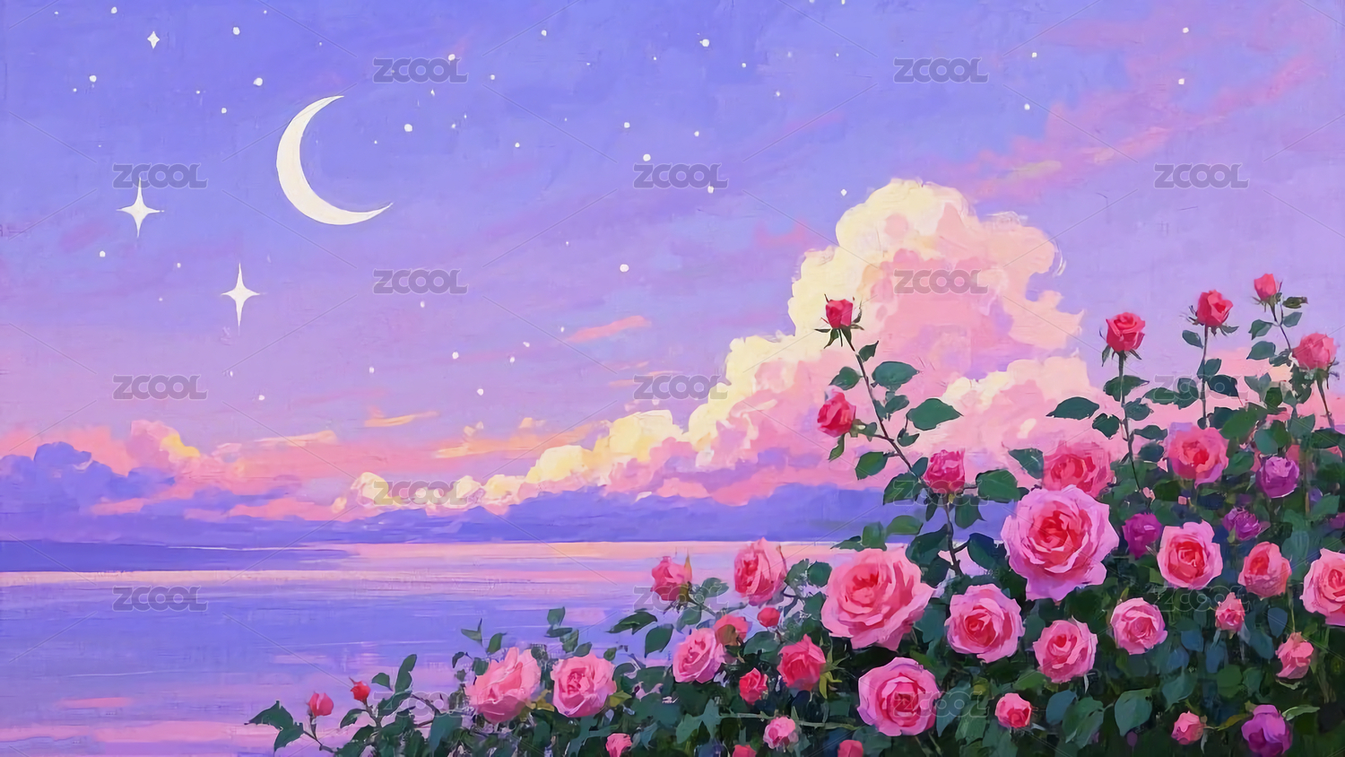 玫瑰,月亮,星空,晚霞,花卉,粉色系,自然风景