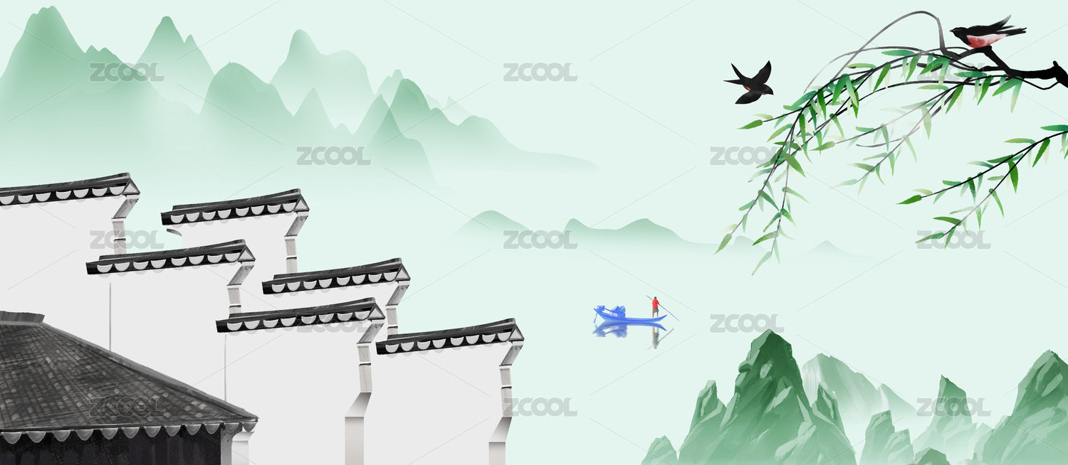 中式古屋粉花绿竹燕子唯美插画