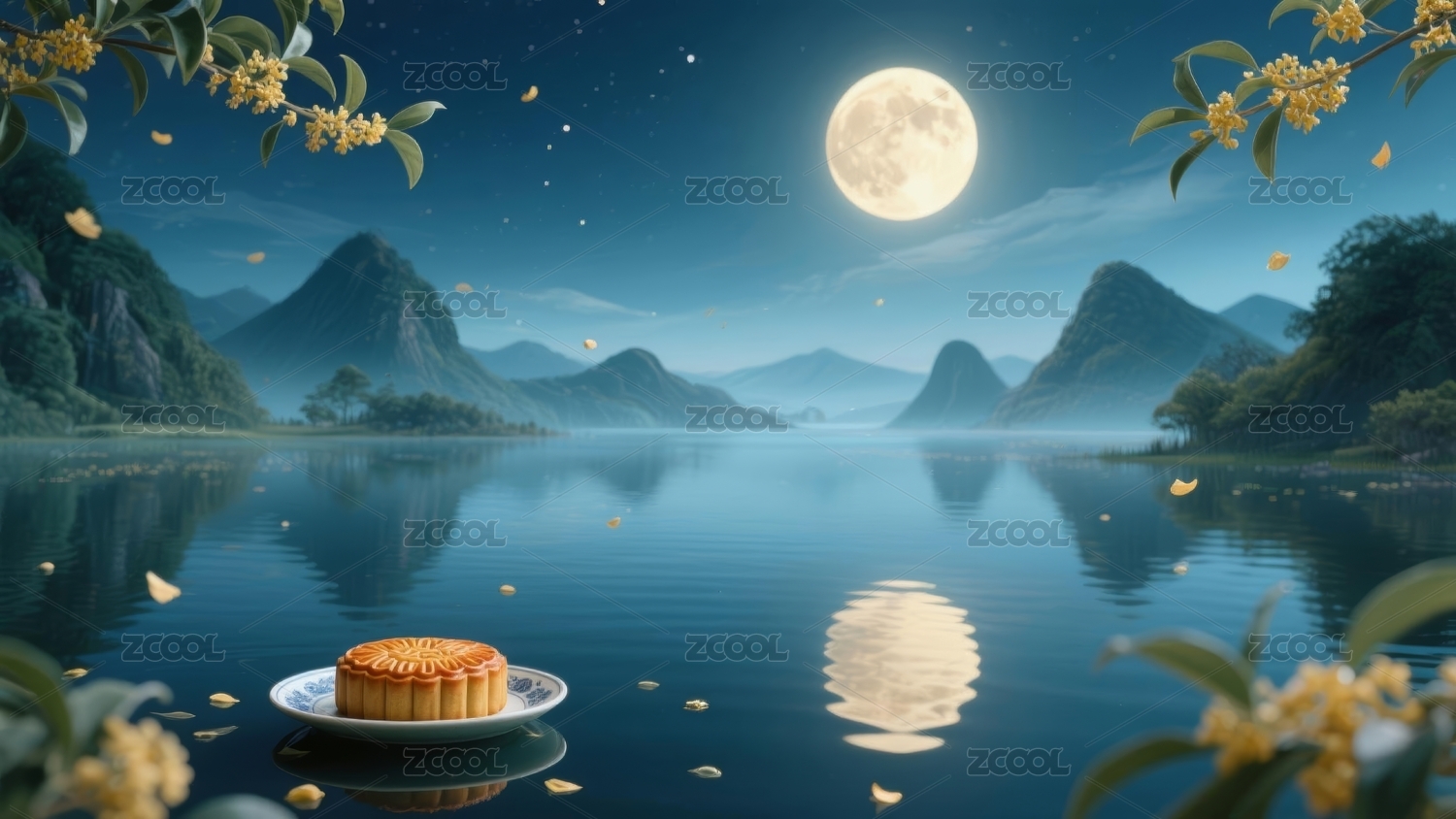 主视觉,月夜,水乡,诗意,场景,月亮,河流,灯笼,建筑,竹子