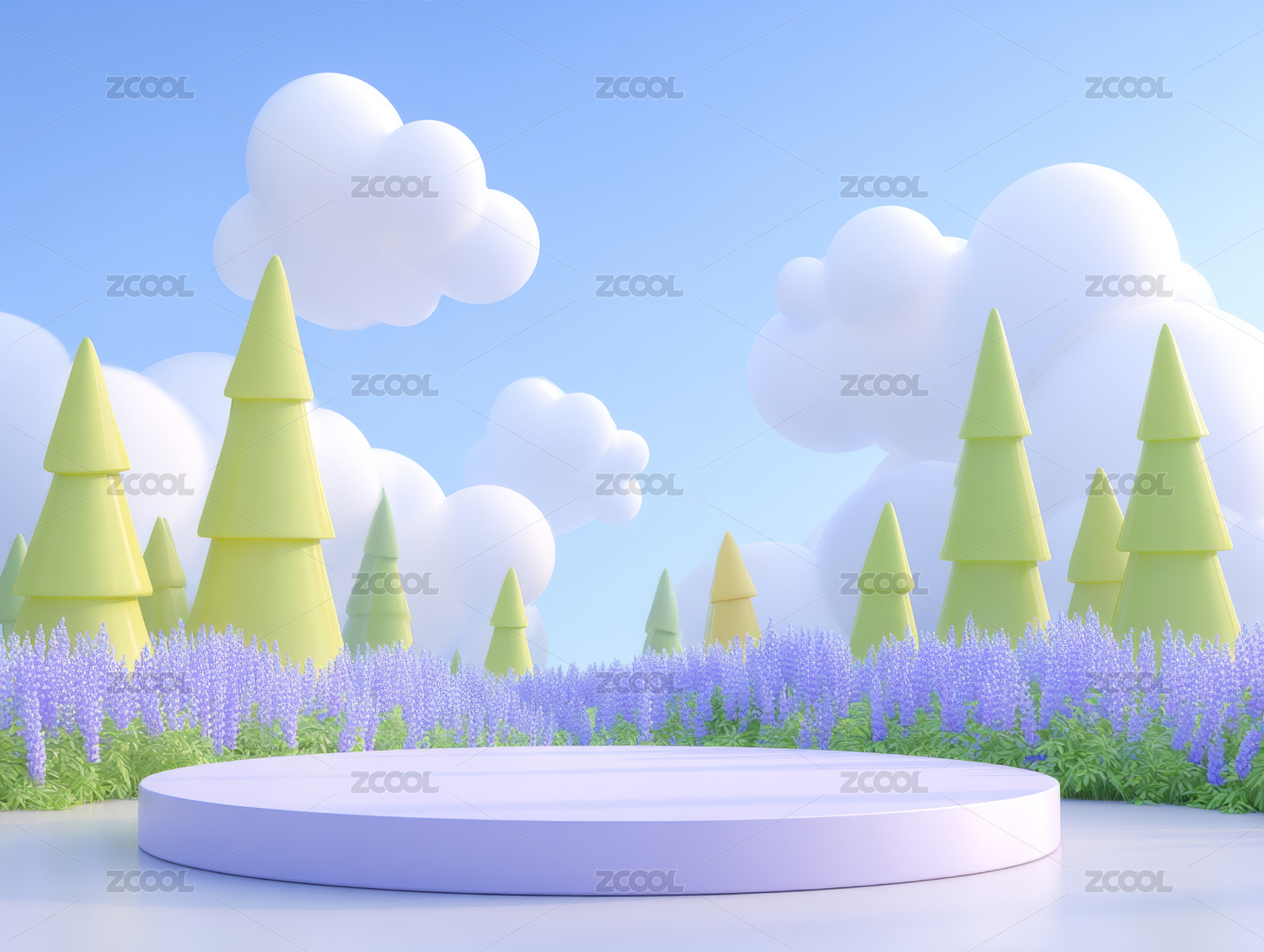 山峰,云朵,草地,花海,展示台,蓝天,绿色,紫色,梦幻,自然