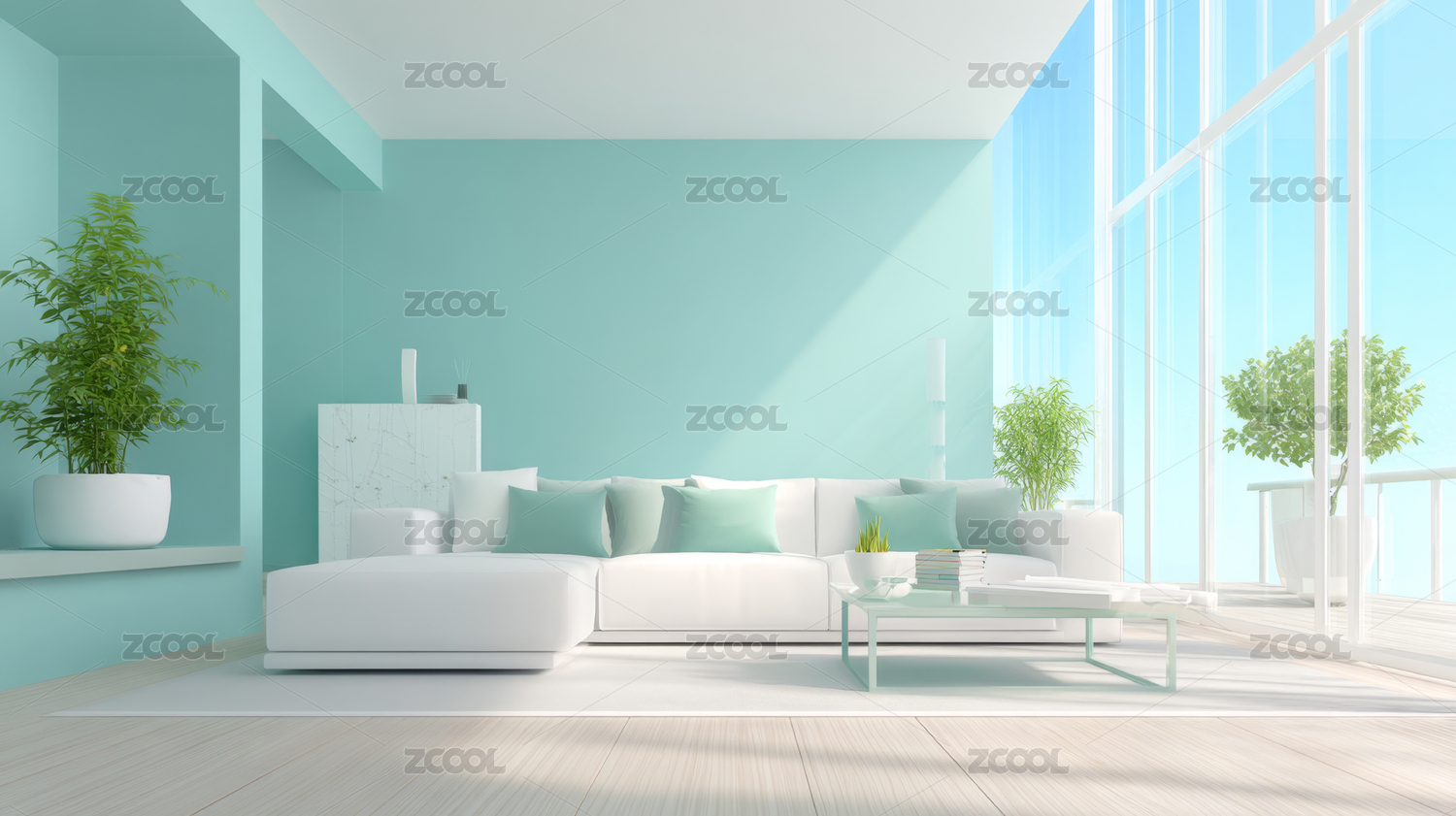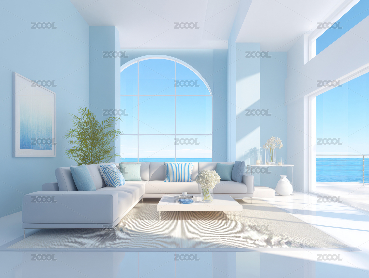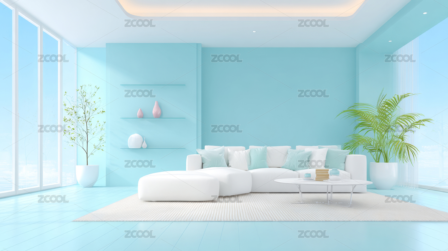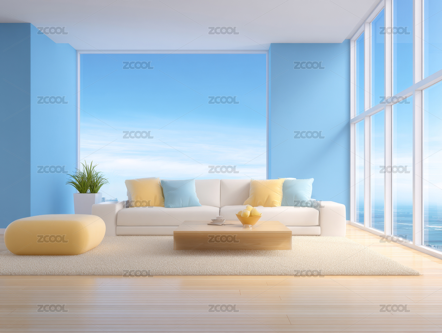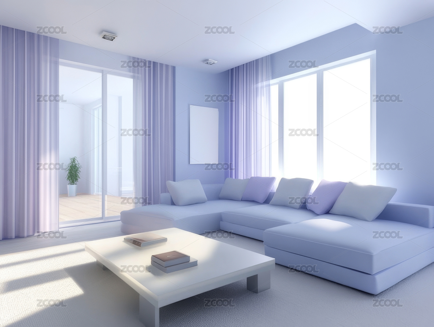 客厅,蓝色,沙发,窗帘,植物,地毯,装饰画,木桌,现代,光线