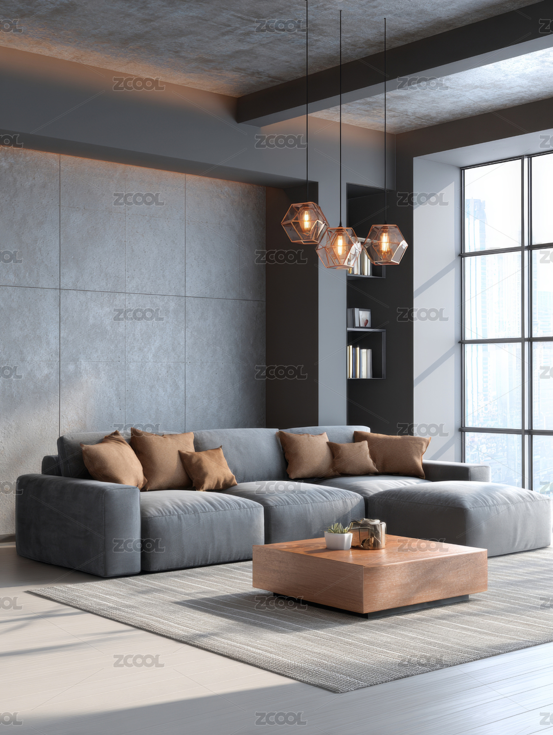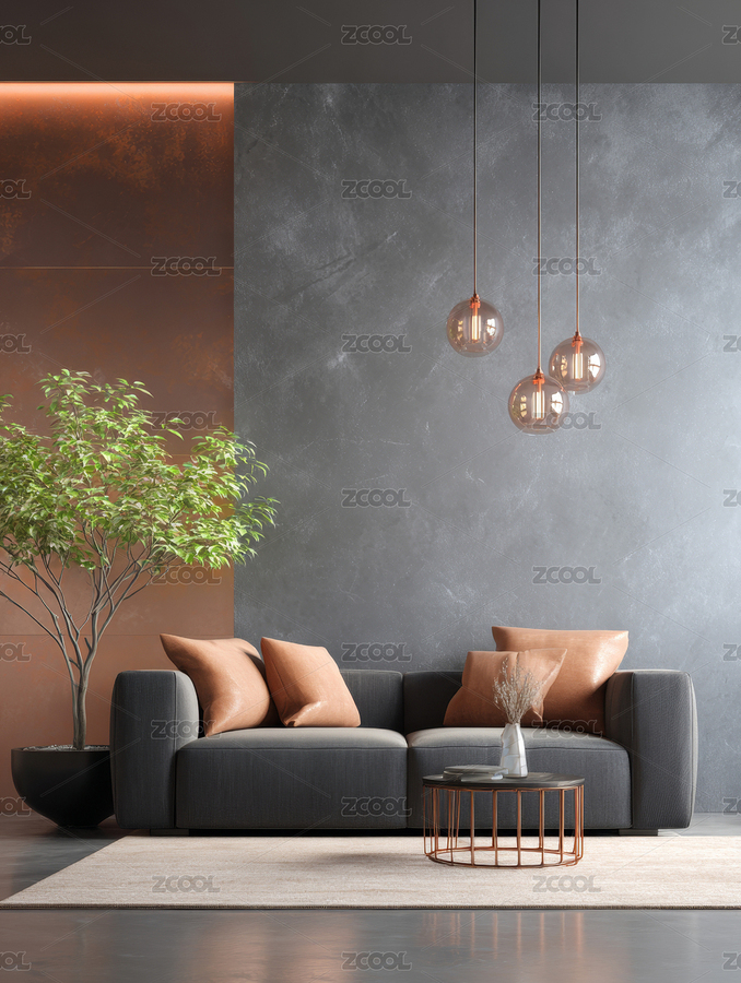 客厅,沙发,吊灯,植物,地毯,灰色,墙面,橙色,装饰,现代