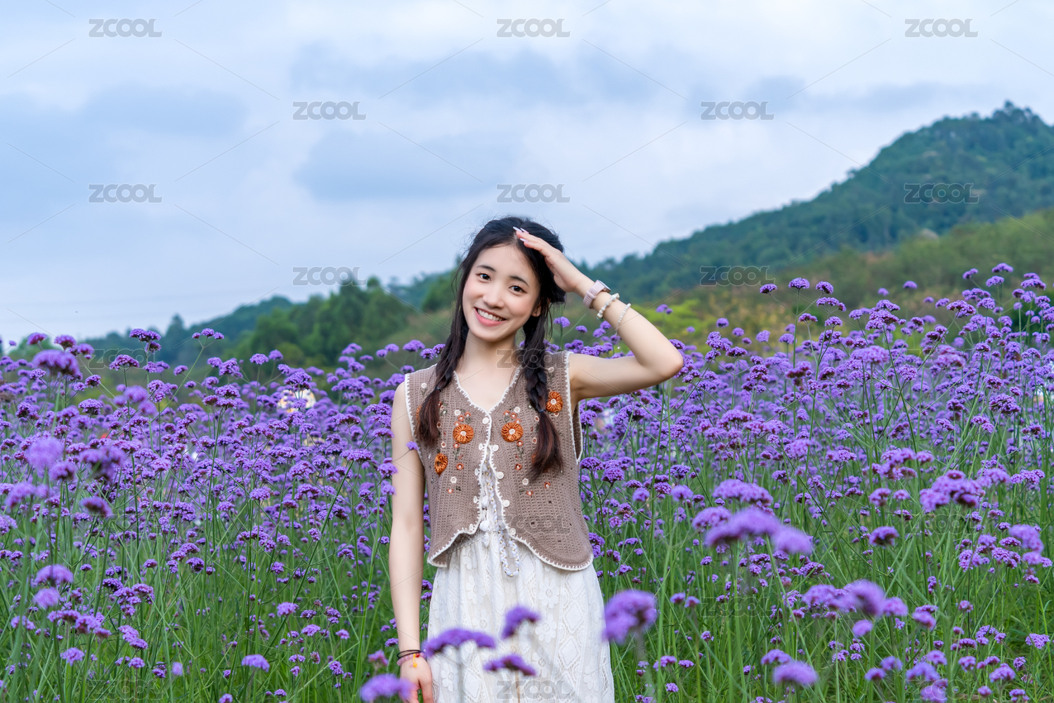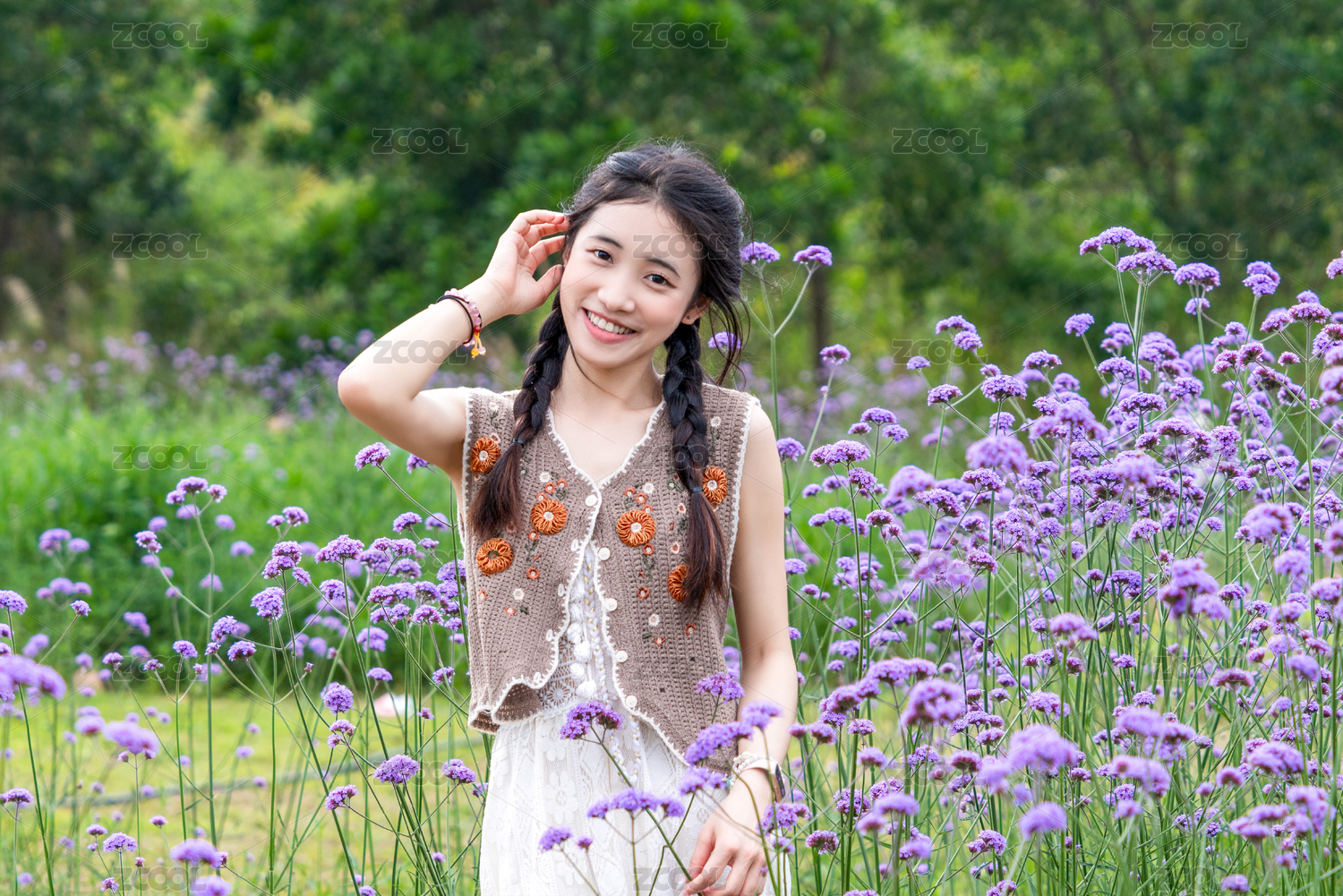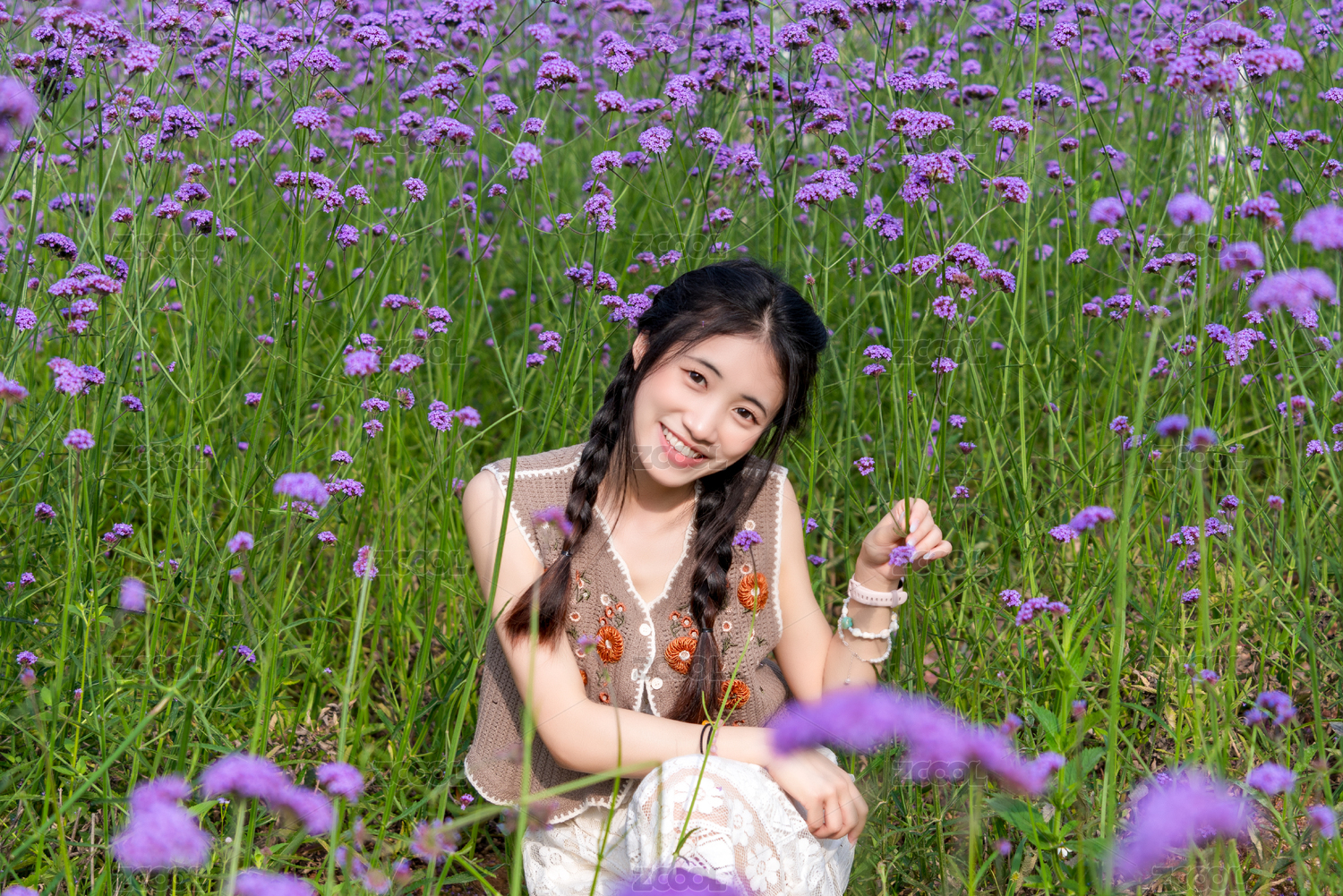 紫色花朵,户外,微笑,花海,自然背景,编发,少女,田园风光,青春气息