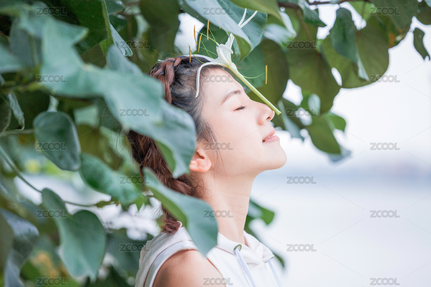女生站在树下拿着鲜花放在额头上