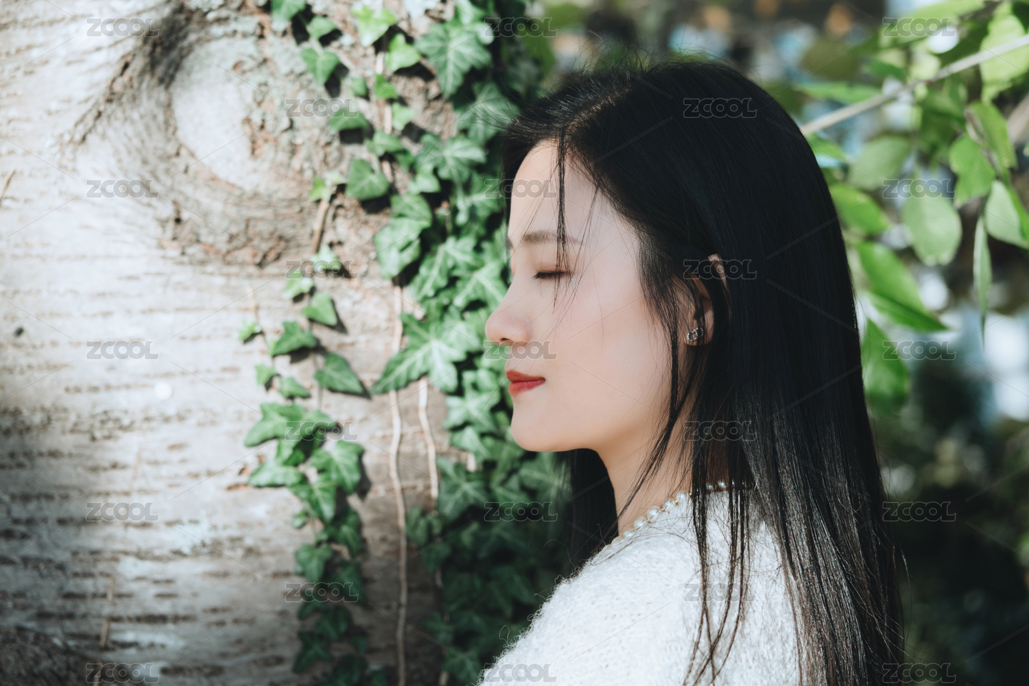 阳光下穿白毛衣的女孩,侧脸特写,绿色背景