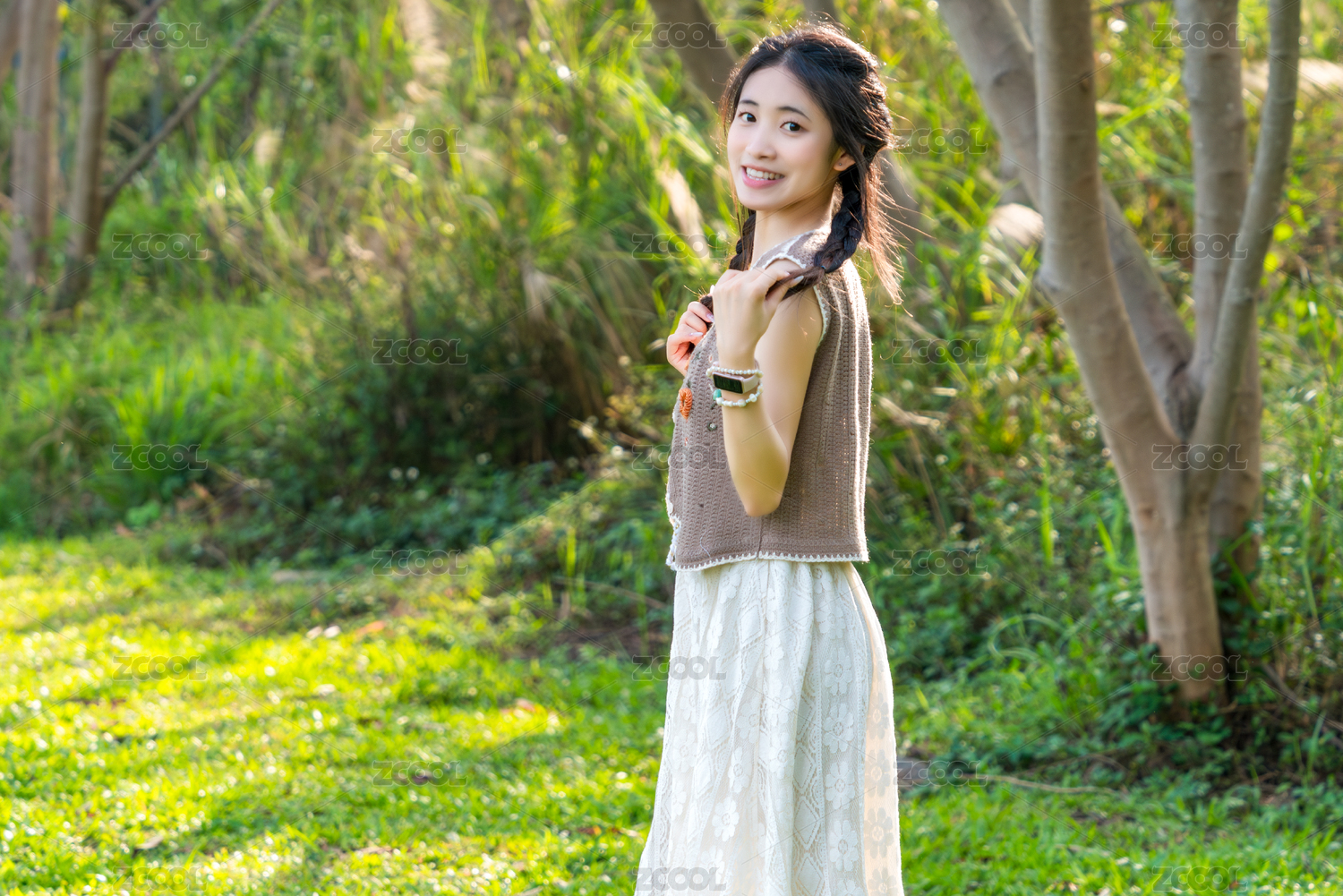 女孩,辫子,自然,手链,阳光,树木,针织背心,绿色,祈祷