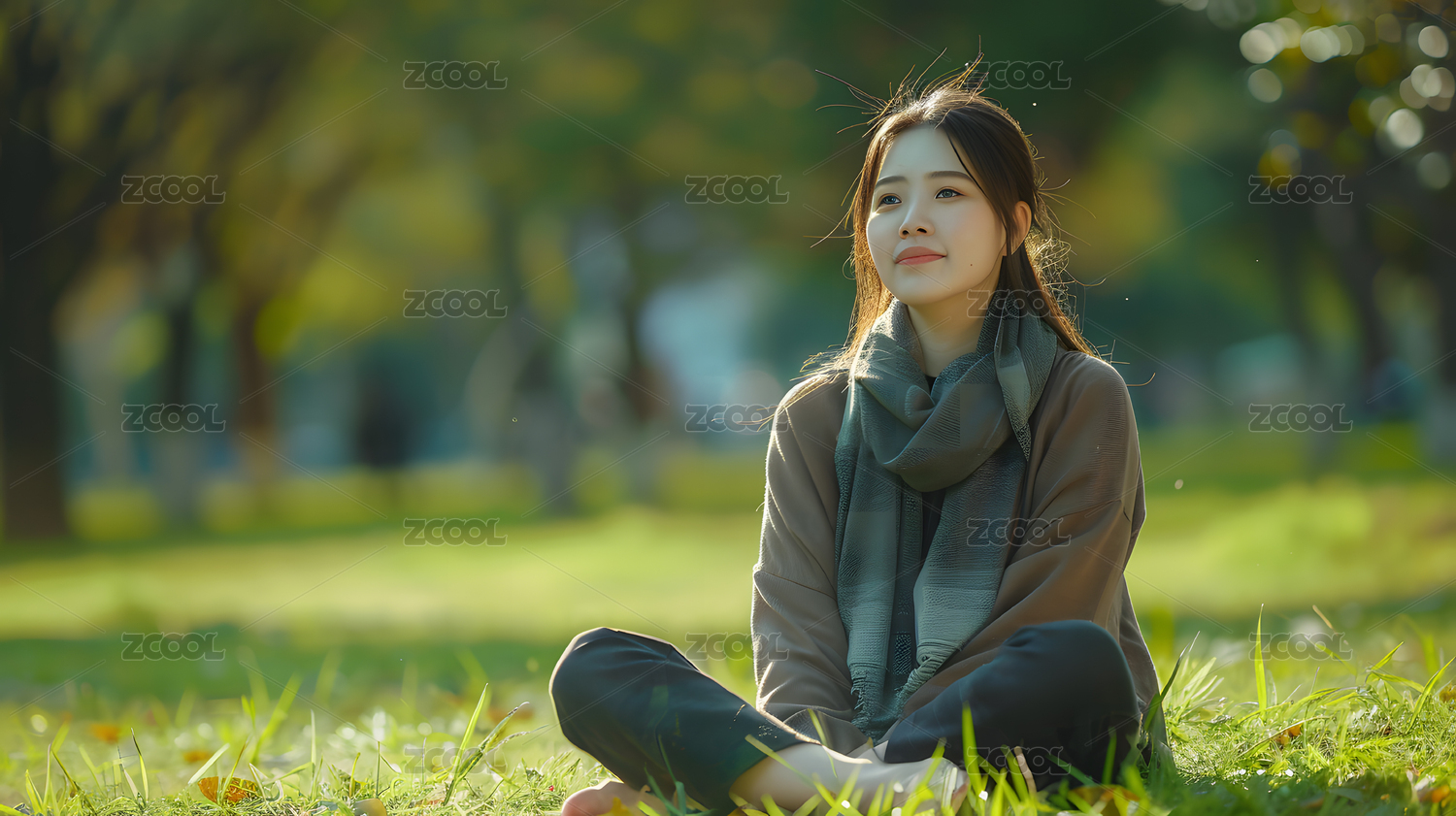 秋天午后,亚裔女性在森林公园中