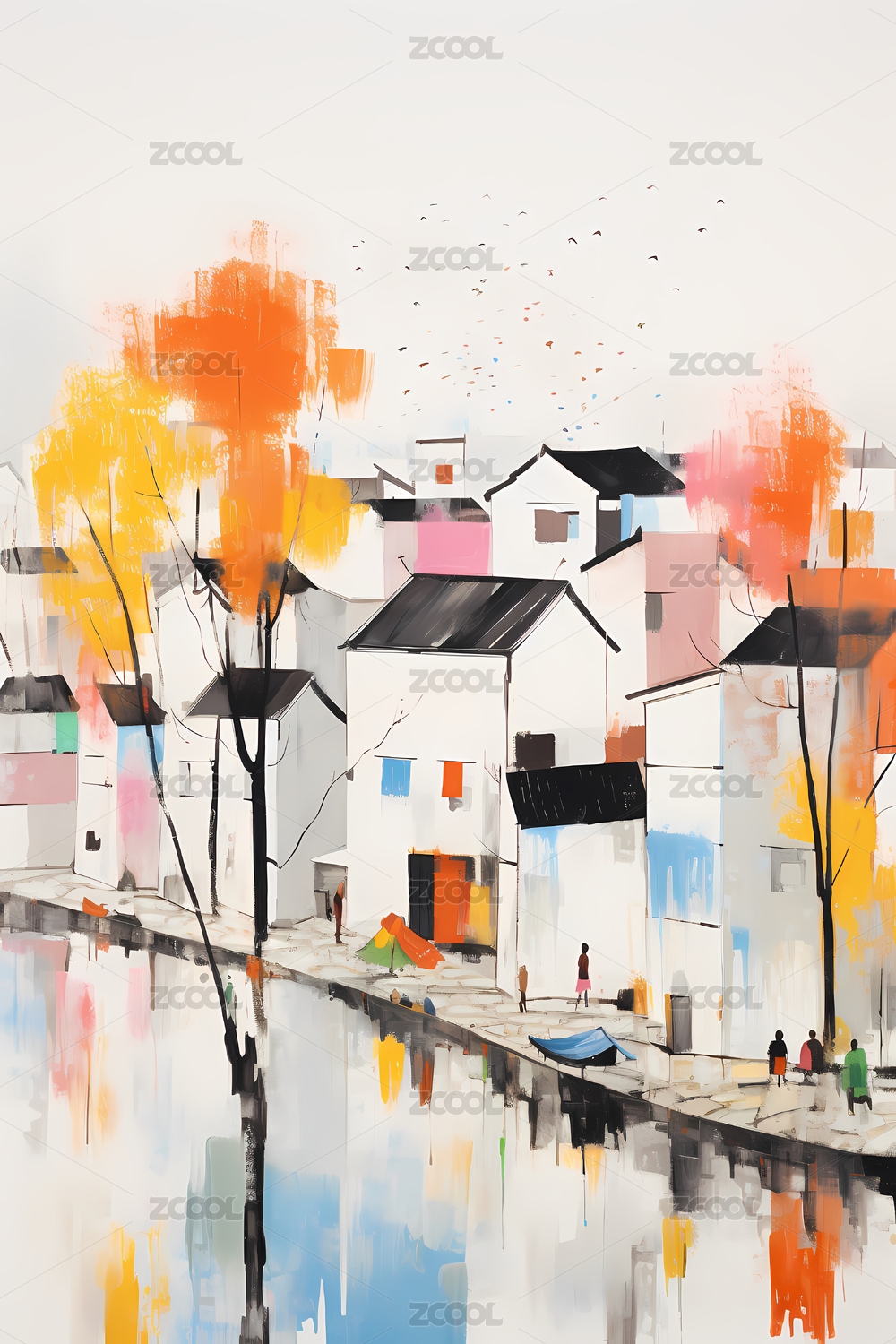 水墨画,江南,村落,徽派建筑,中国风,古镇,民居,黑白,建筑群,房屋