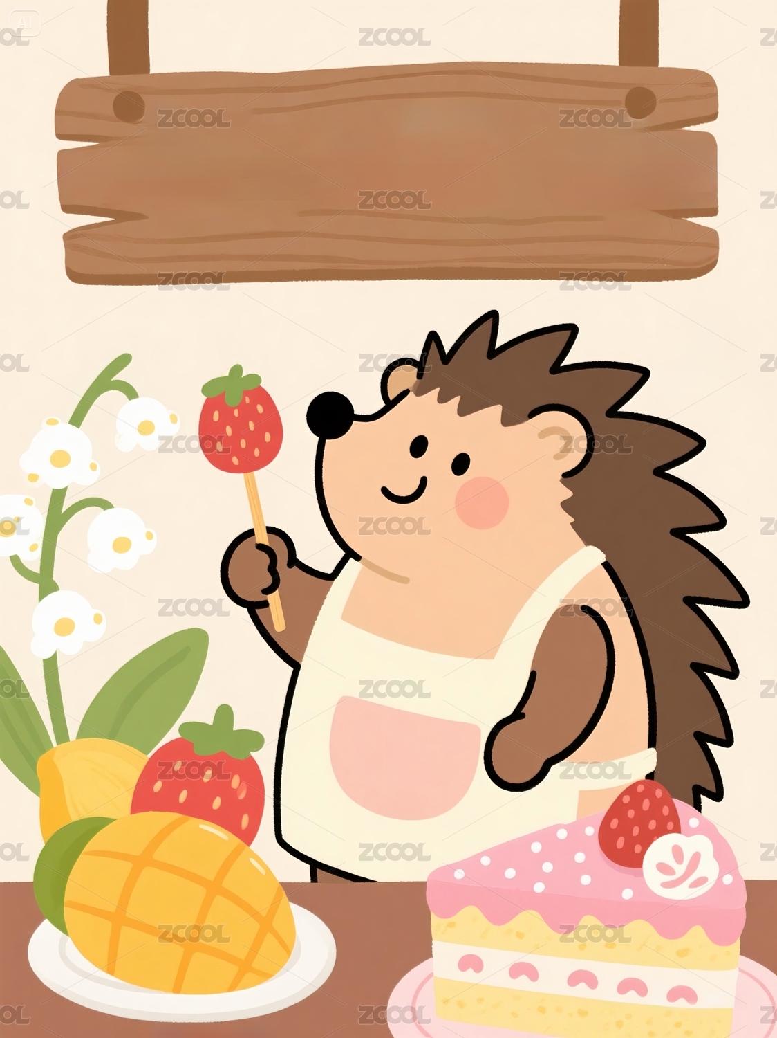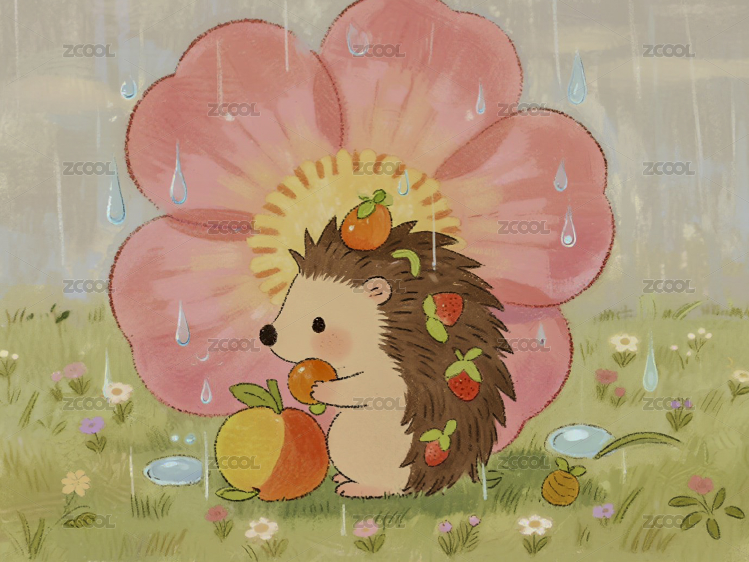 下雨,刺猬,避雨,花朵,卡通,插画,绘画,水彩,童话,儿童