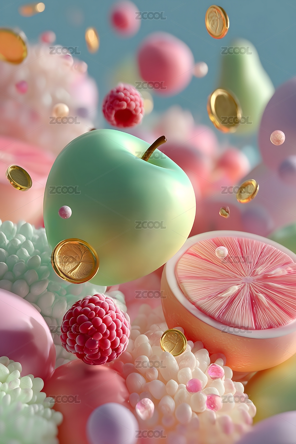 梦幻,水果,插画,苹果,橙子,树莓,色彩柔和,甜美,浪漫,艺术创作