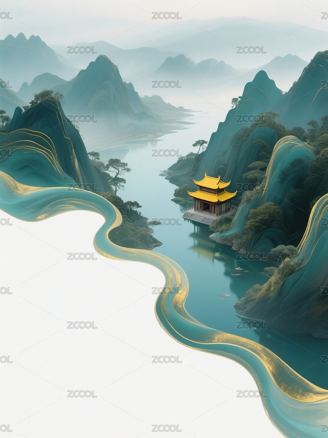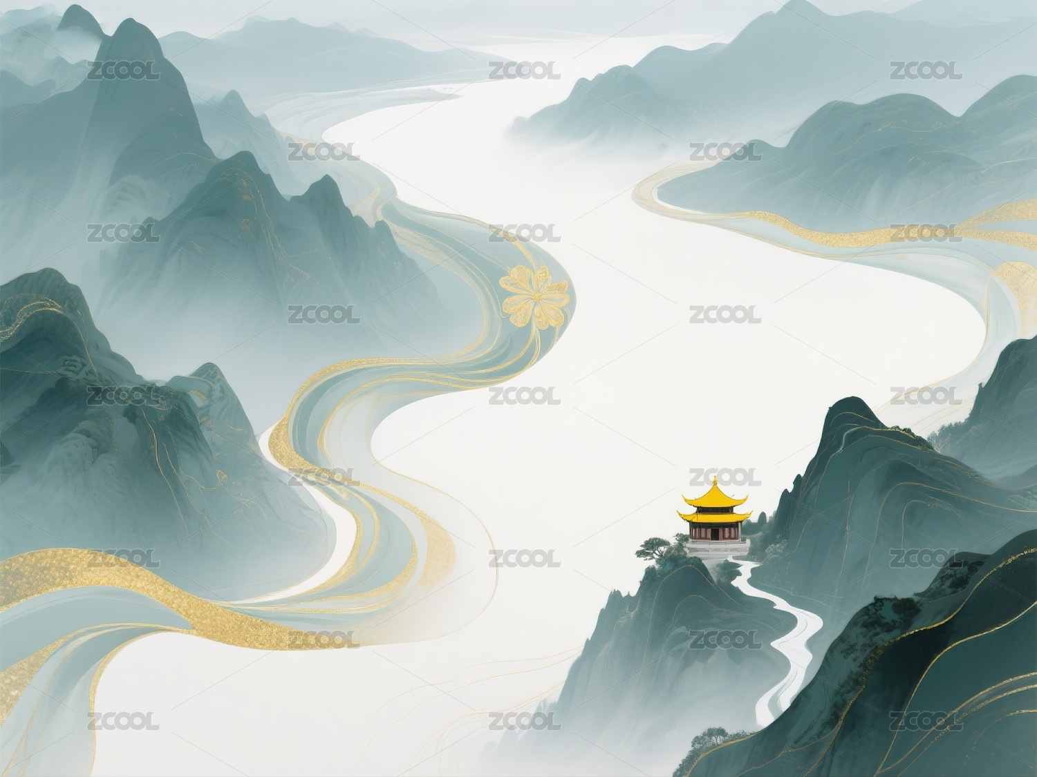 抽象,线条,古风,中国风,传统,山水,国画,金线,亭子,古建筑