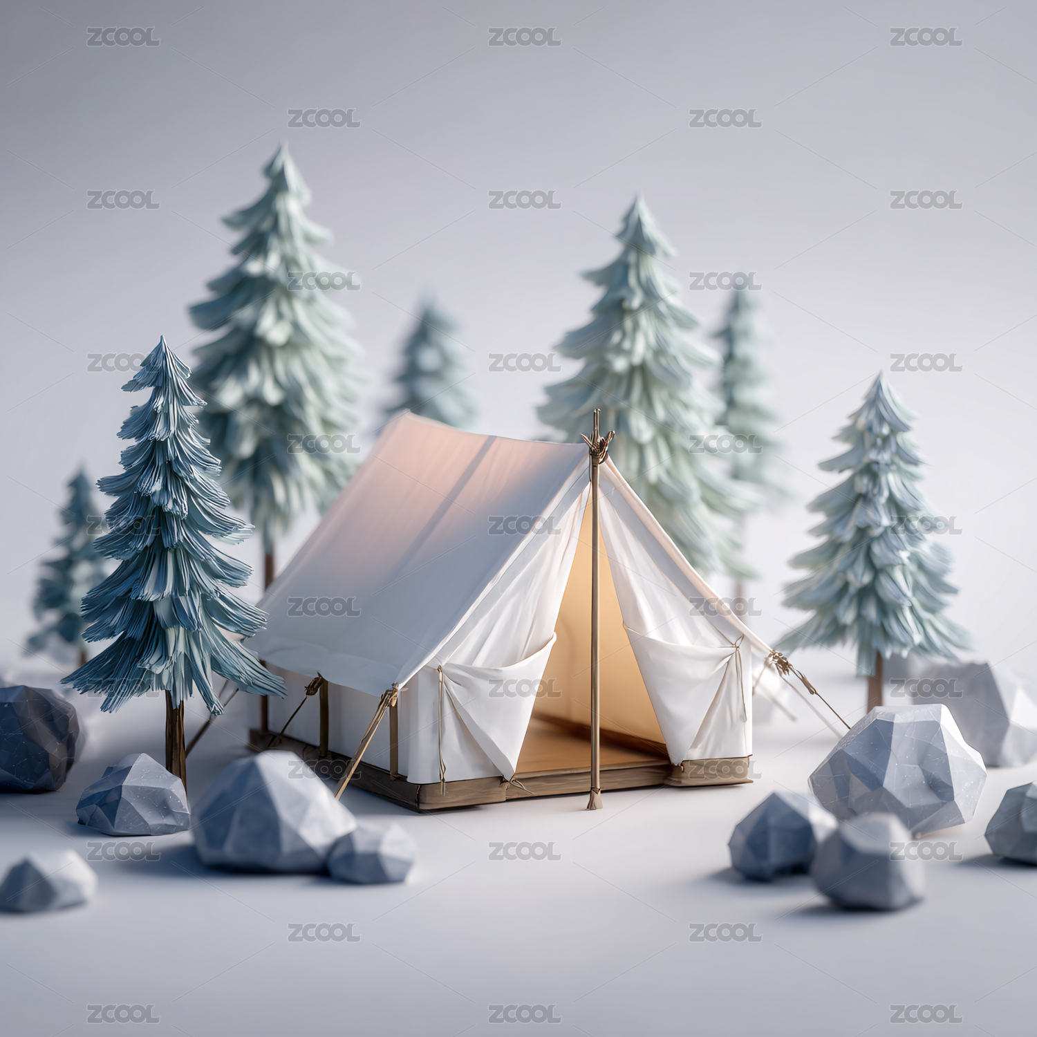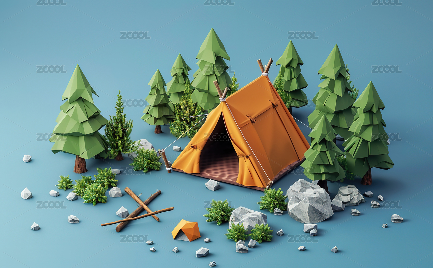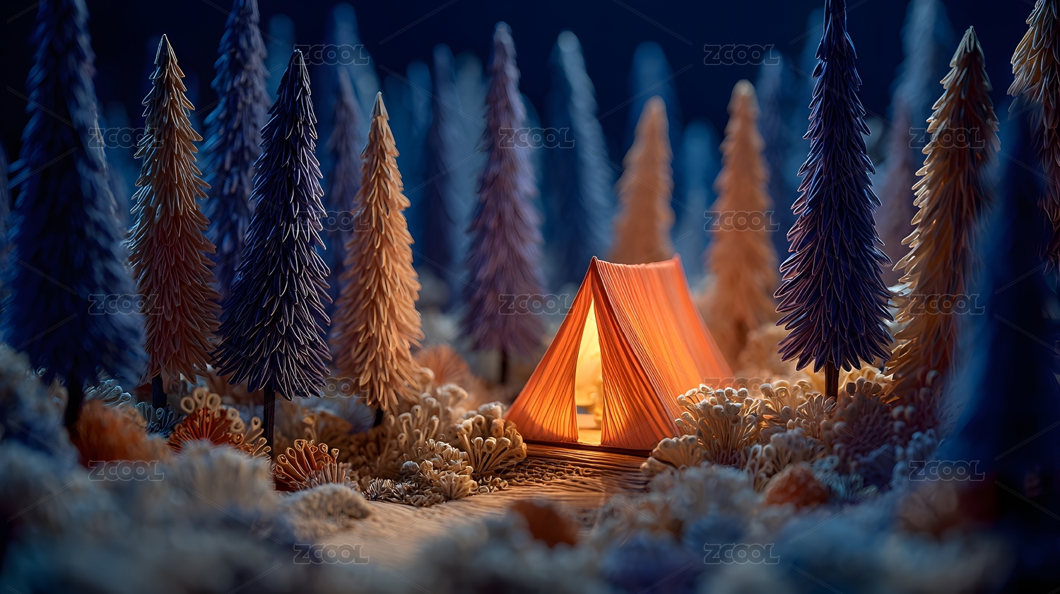 露营,帐篷,森林,松树,户外,极简,模型,场景,度假,旅行