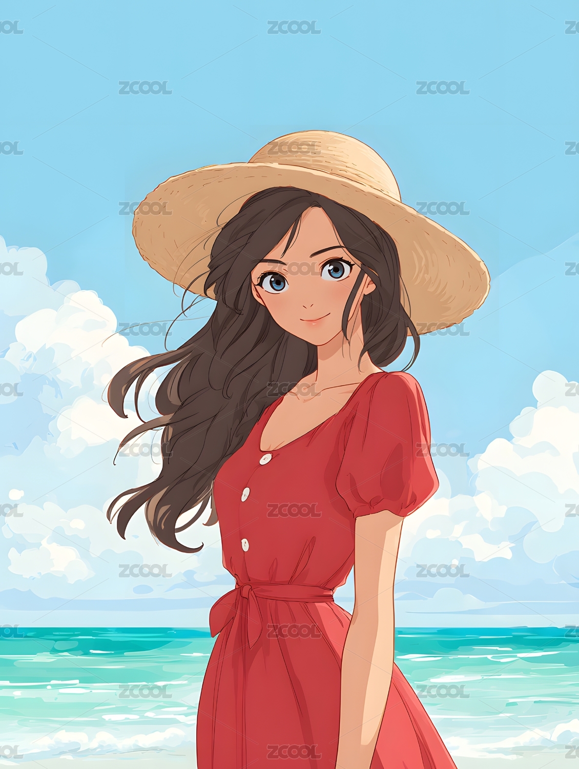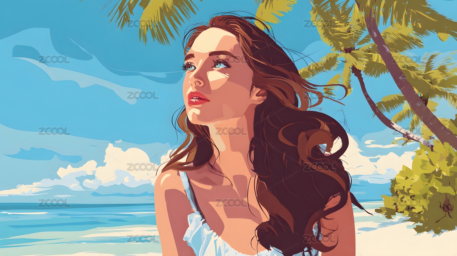 艺术,插画,自然,沙滩,风景,美丽,海边,长发,人物,时尚