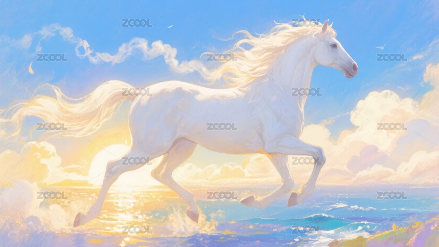 奔跑的白色骏马于海天之间