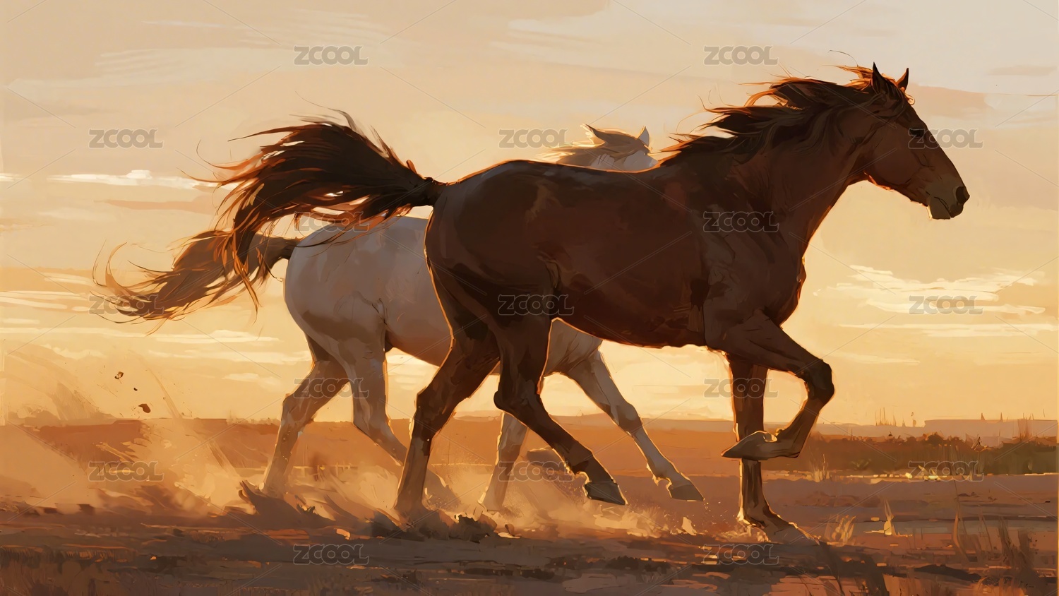 夕阳下奔腾的骏马