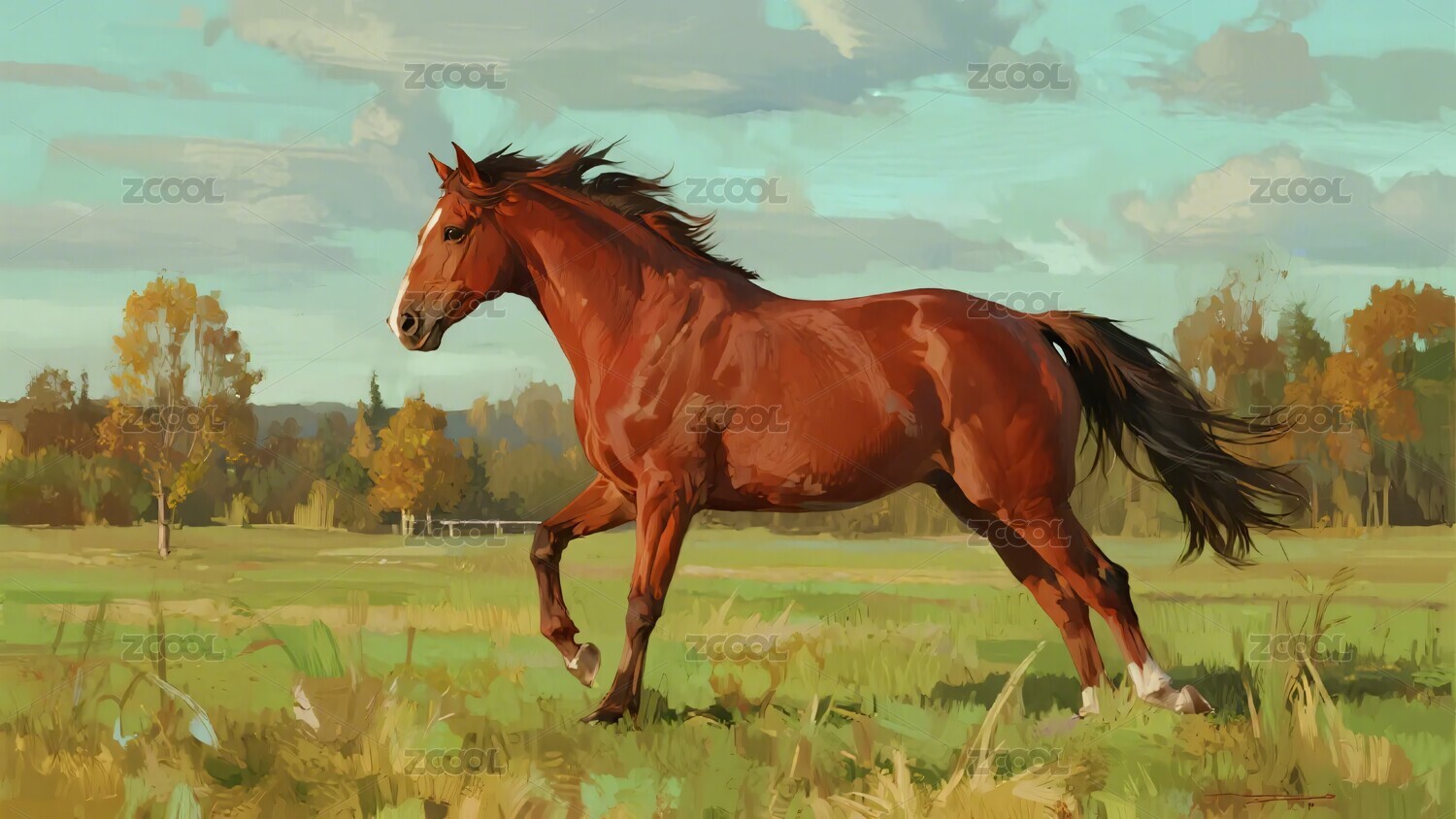 骏马,草原,山脉,自然,风景,奔跑,油画,动物,户外,蓝天白云