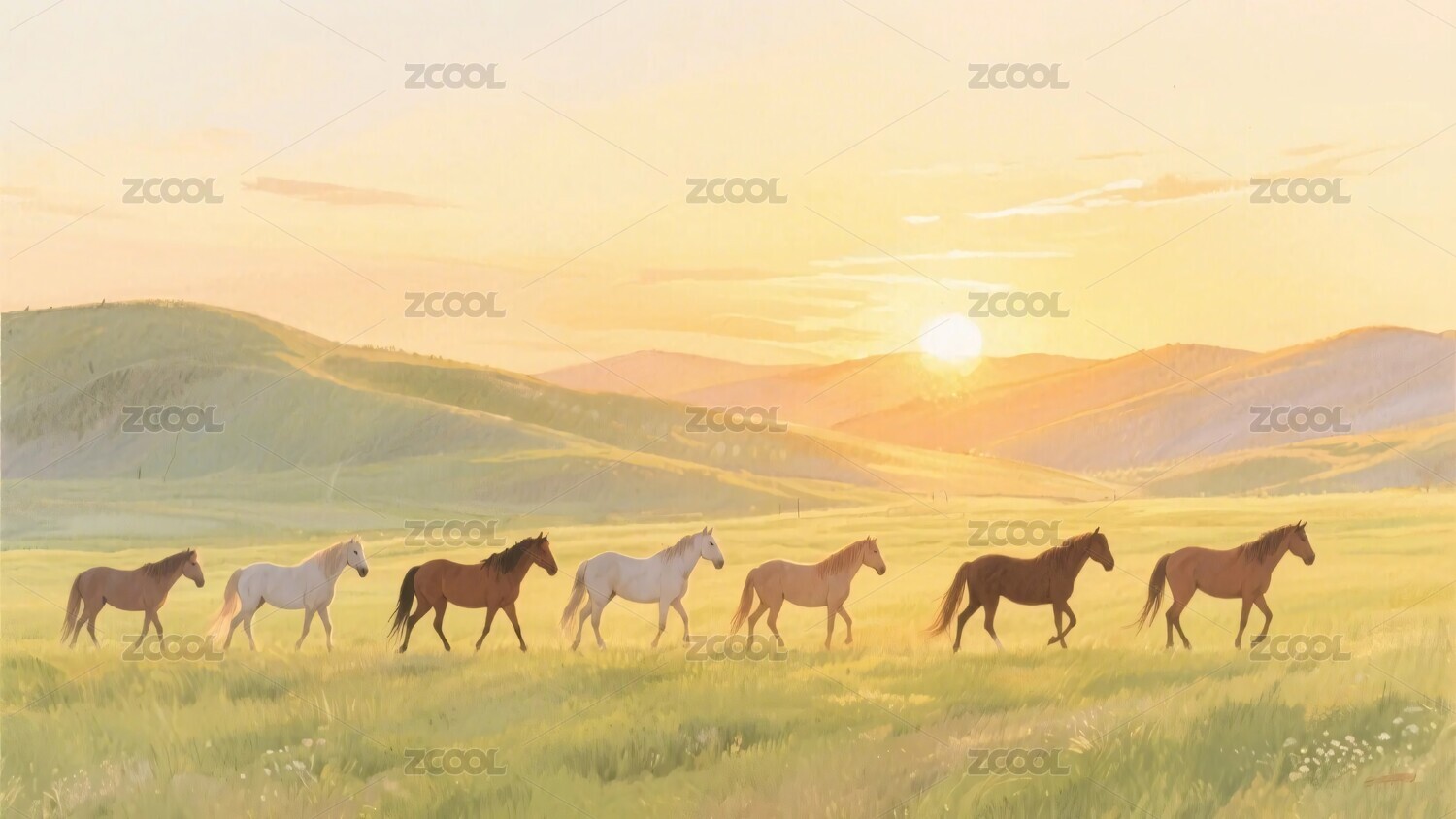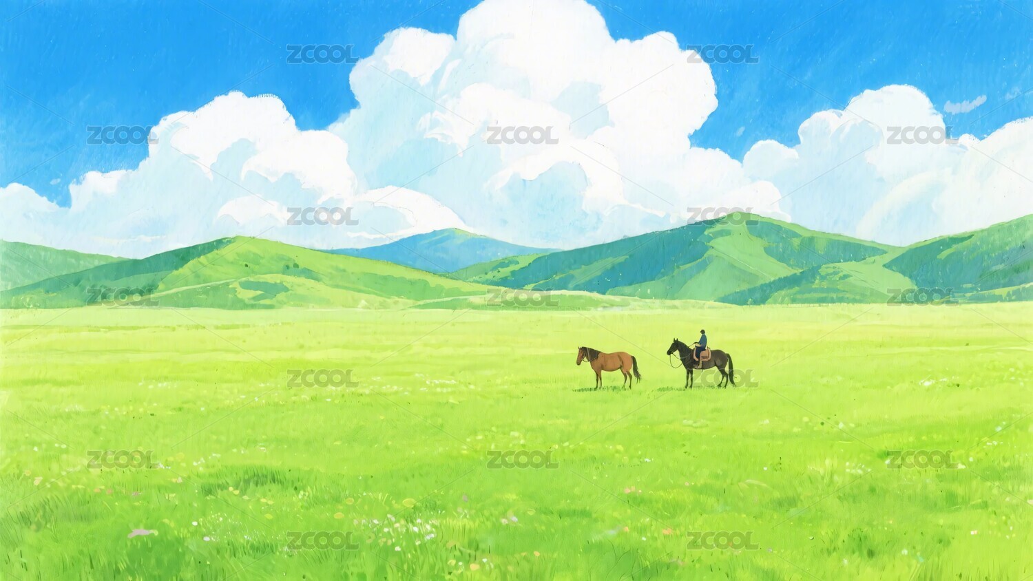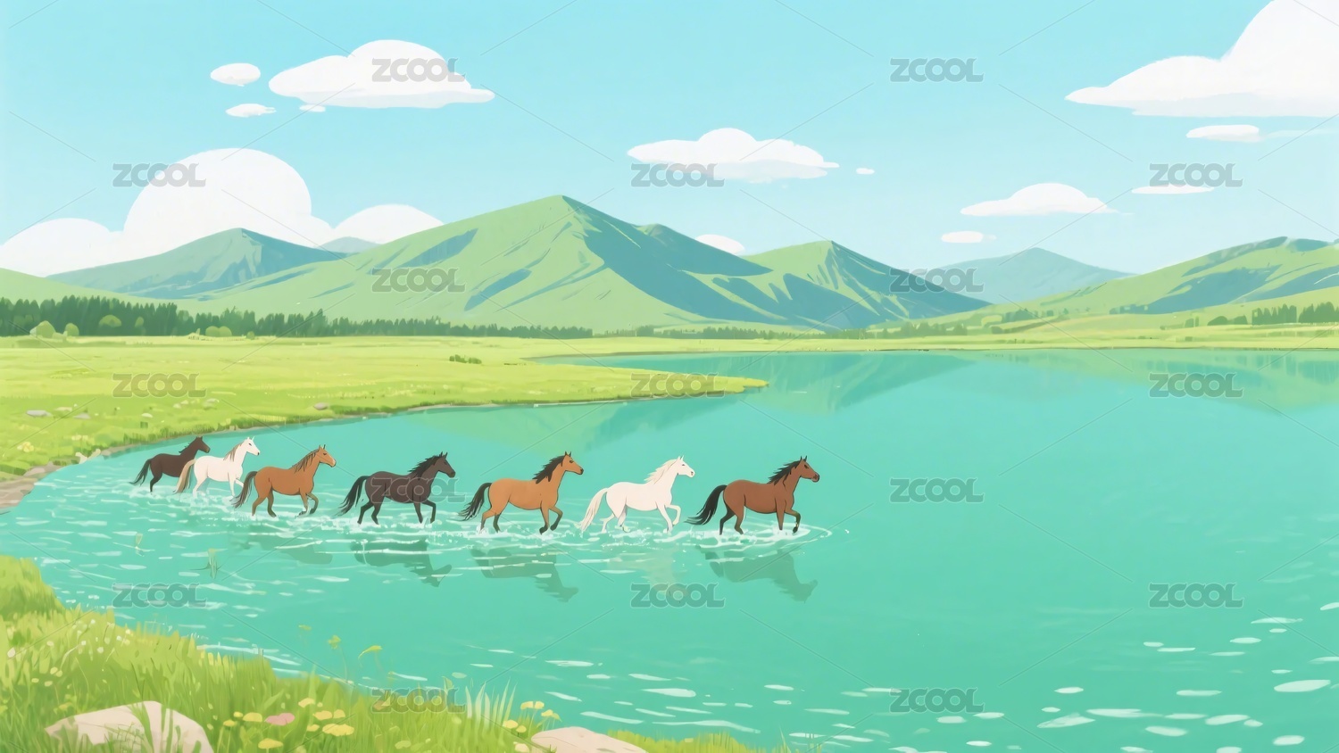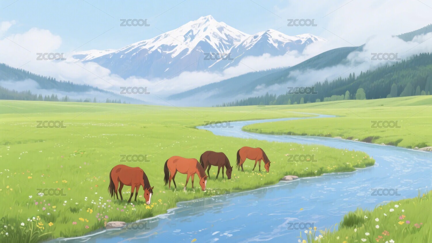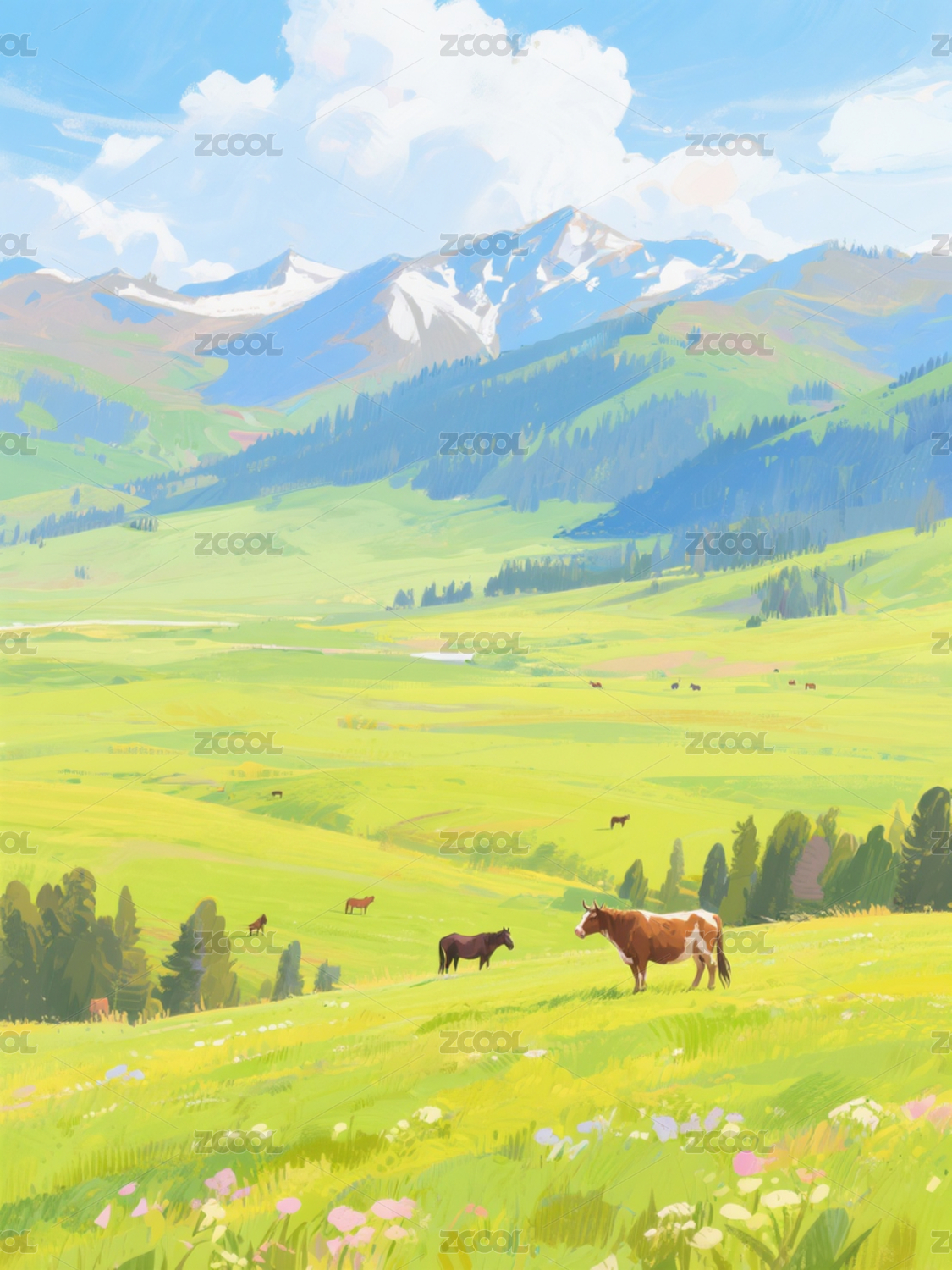 草原,溪流,草地,插画,风景,自然,田园,动物,画面元素,背景
