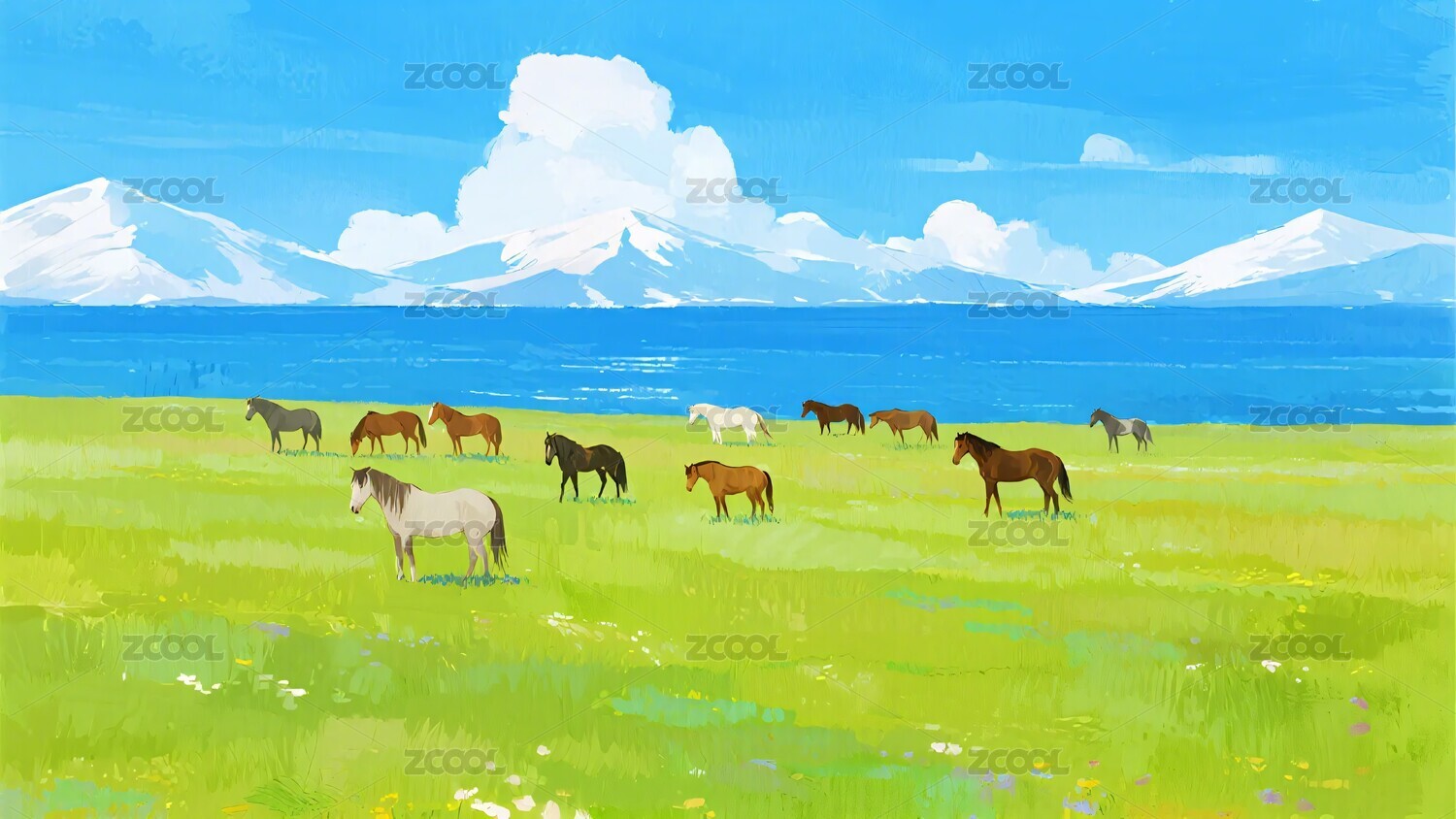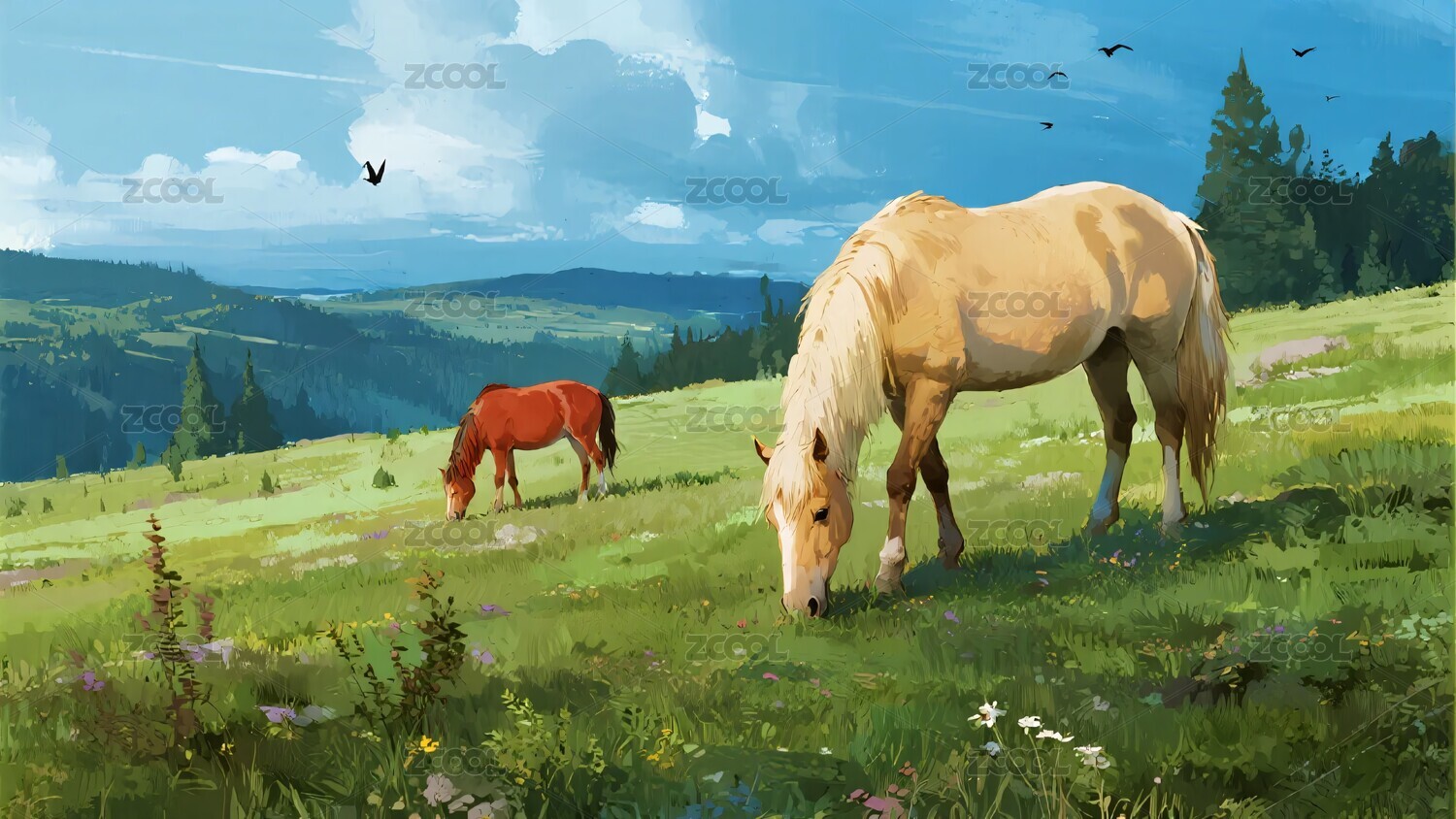 草原,群马,草地,蓝天,白云,插画,自然,风景,动物,户外