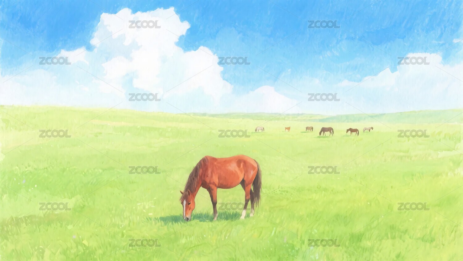 草原,群马,草地,蓝天,白云,插画,风景,自然,动物,户外