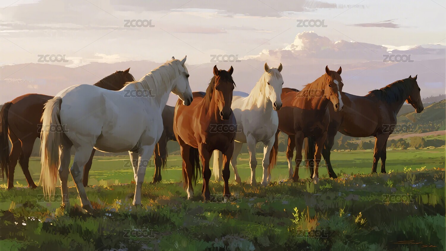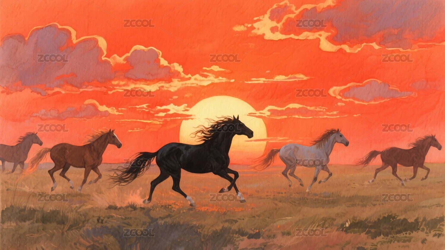 草原马群日落插画