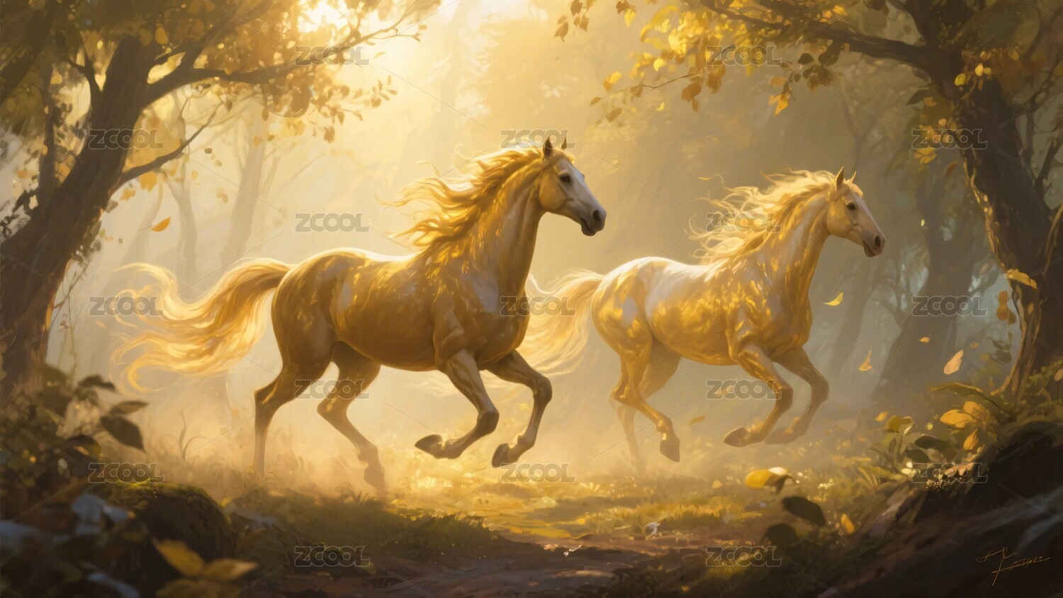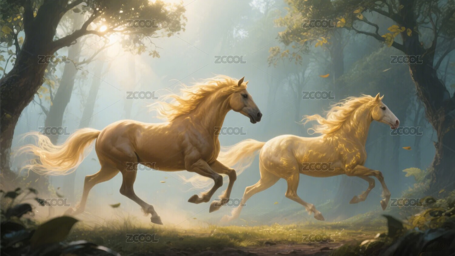 林中双马奔腾的梦幻场景