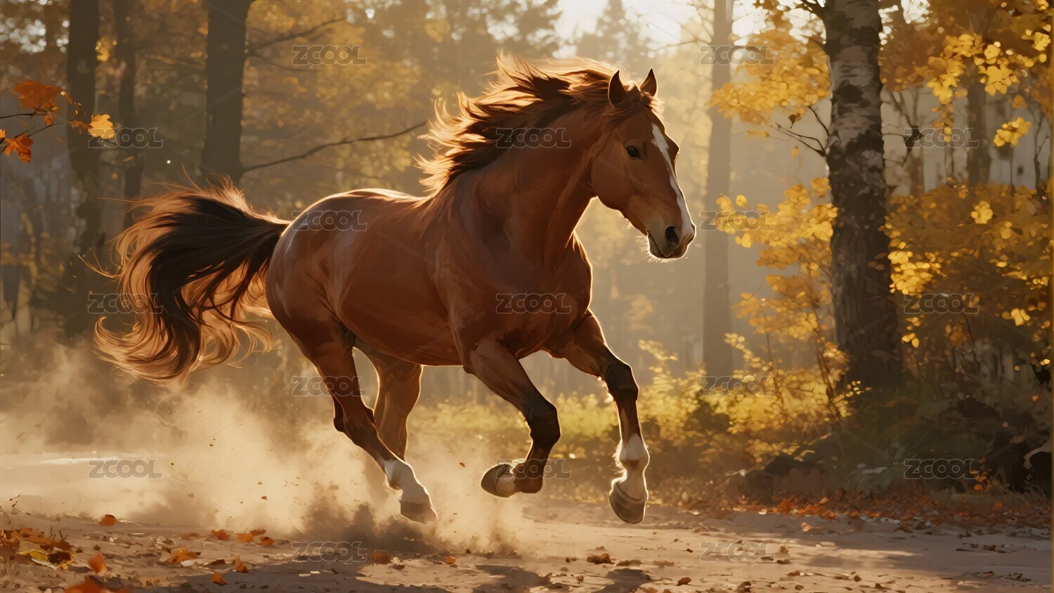 骏马,树林,奔跑,秋天,落叶,阳光,自然,风景,动物,插画