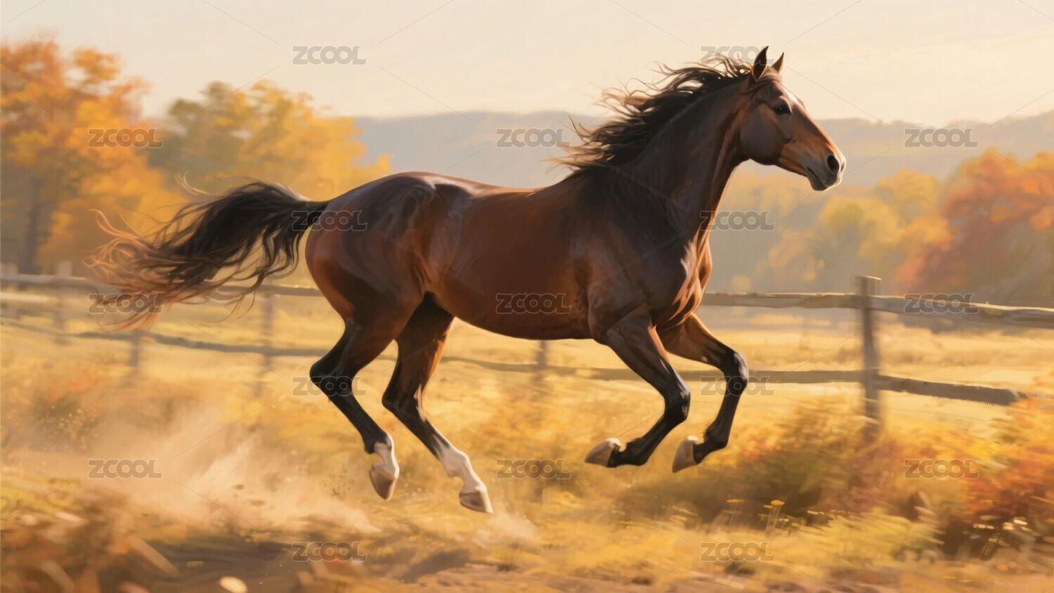 秋日草原上奔腾的骏马