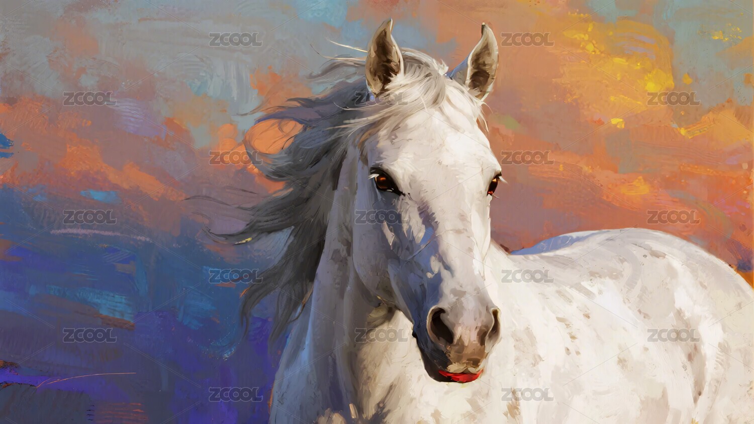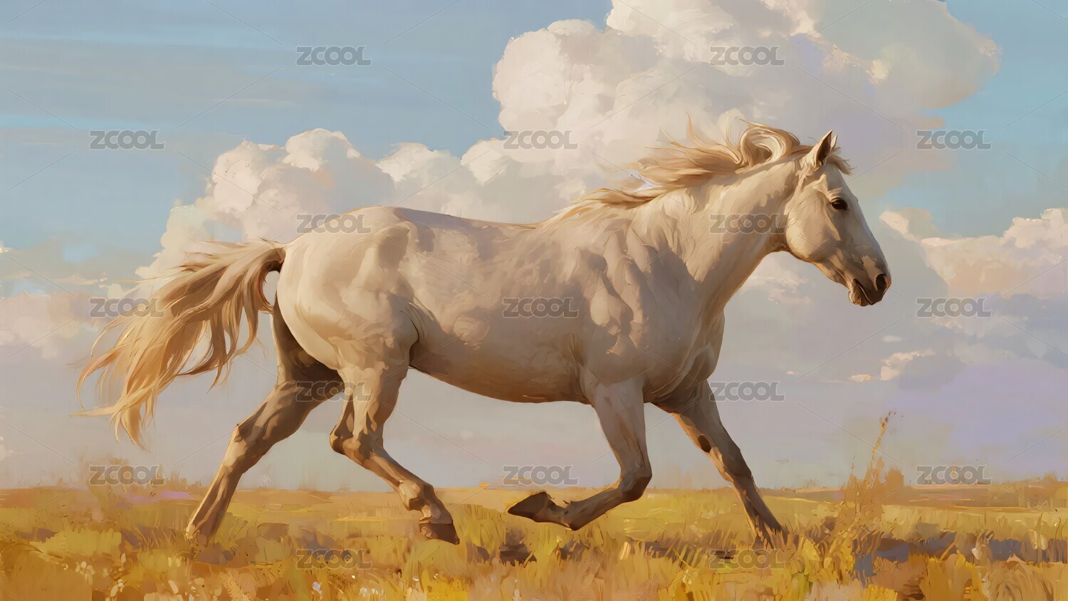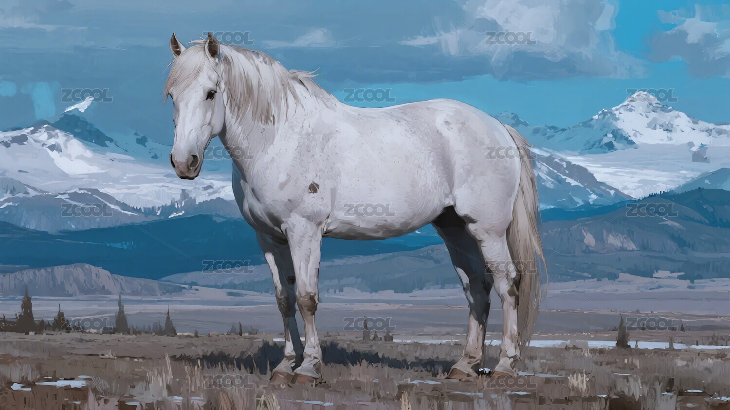 白马,旷野,山景,插画,风景,动物,自然,油画风,骏马,岩石