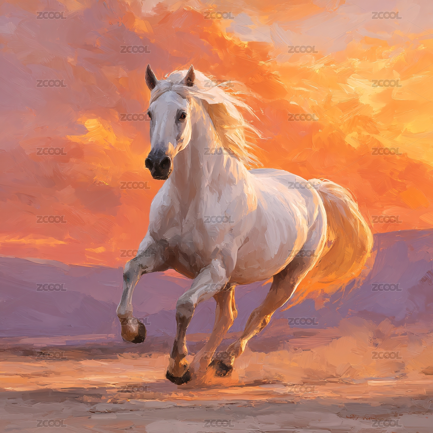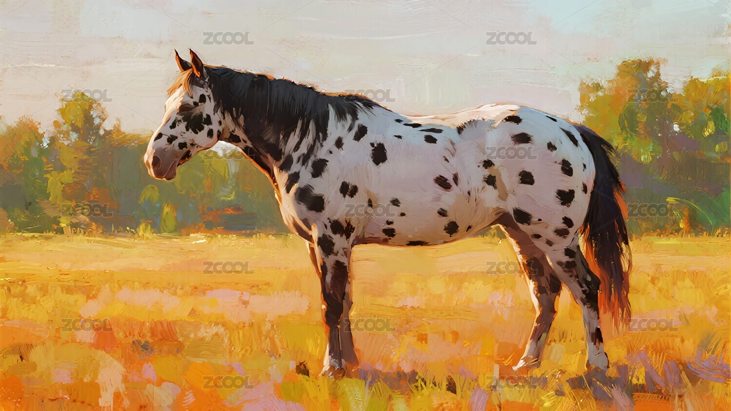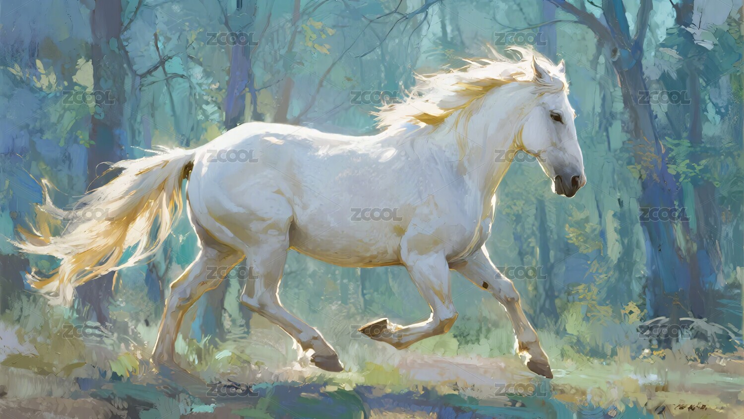 白马,旷野,山景,插画,风景,动物,自然,油画风,骏马,岩石