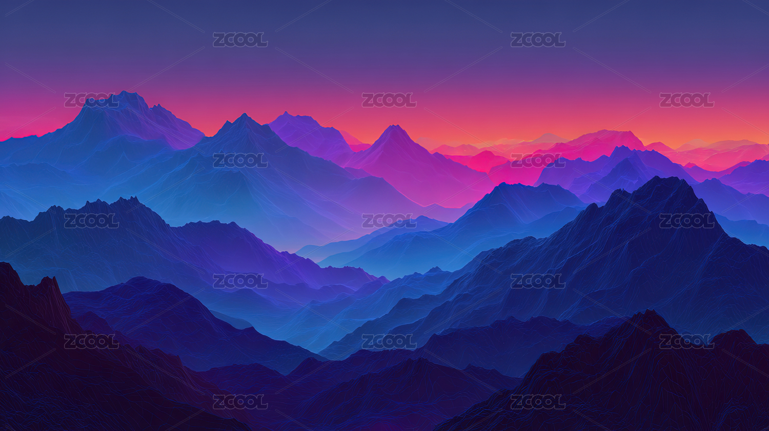粉紫渐变天空下群山层叠呈现梦幻清新的插画
