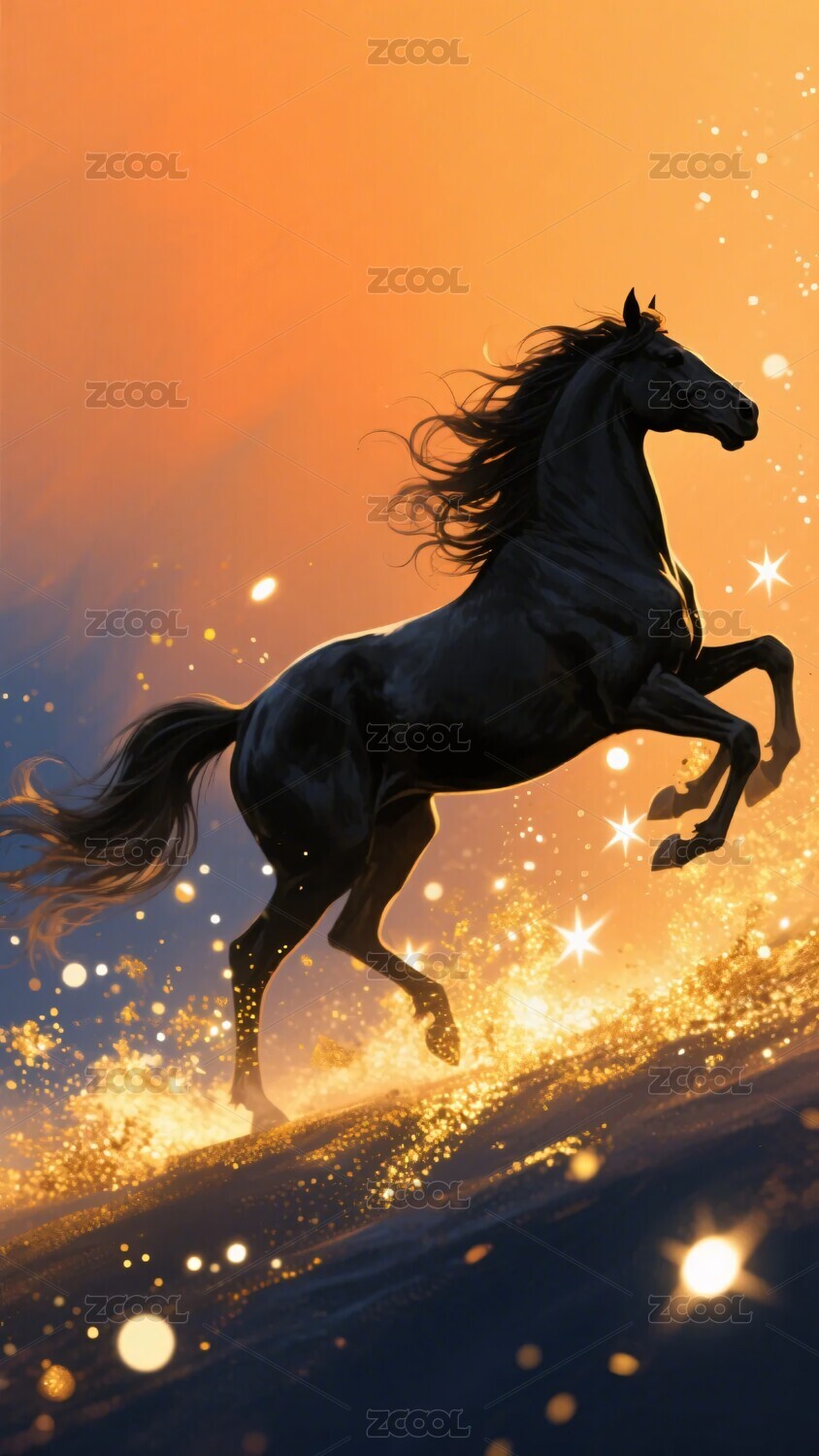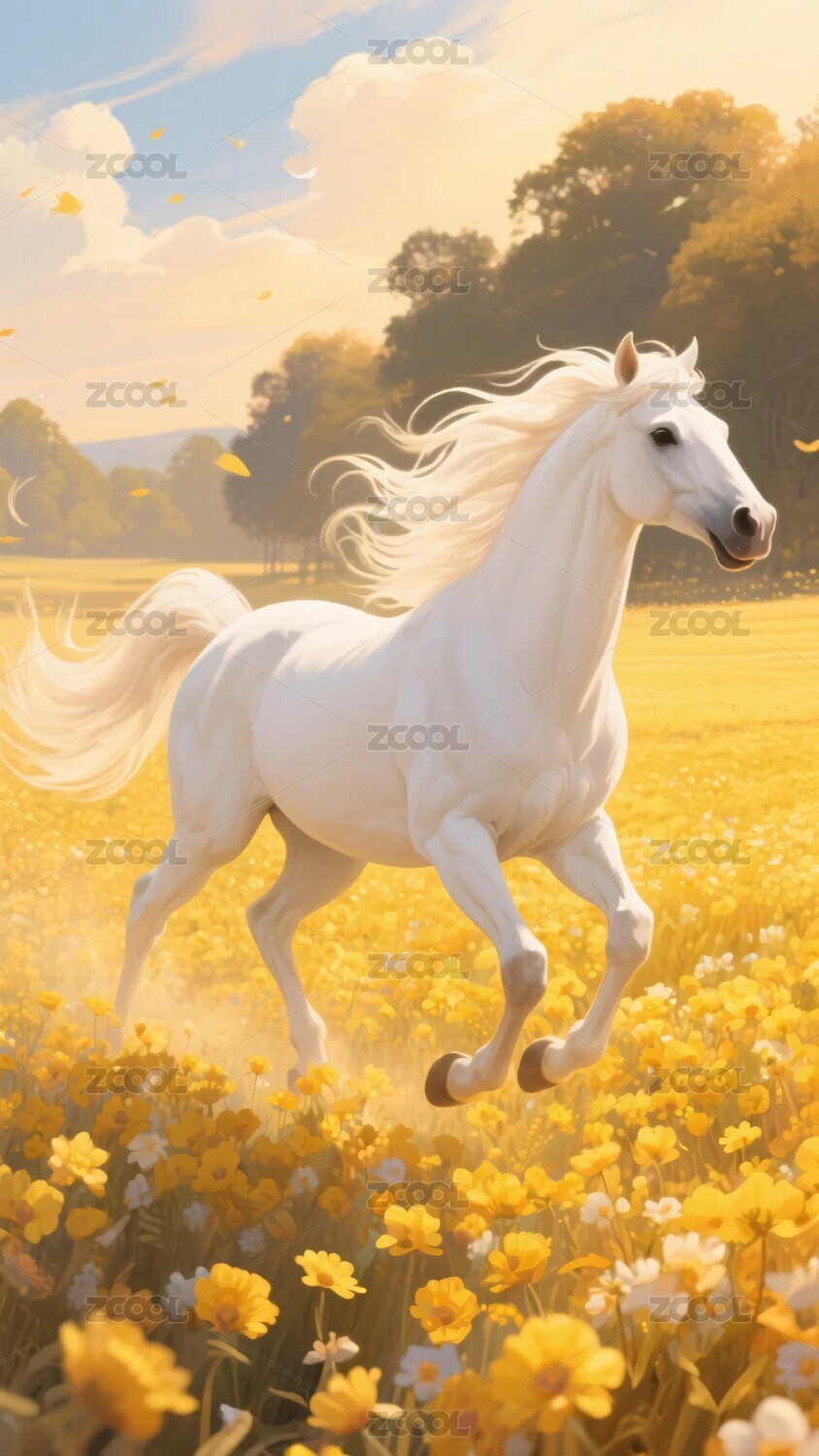 骏马,奔跑,旷野,天空,云朵,草地,插画,风景,动物,自然