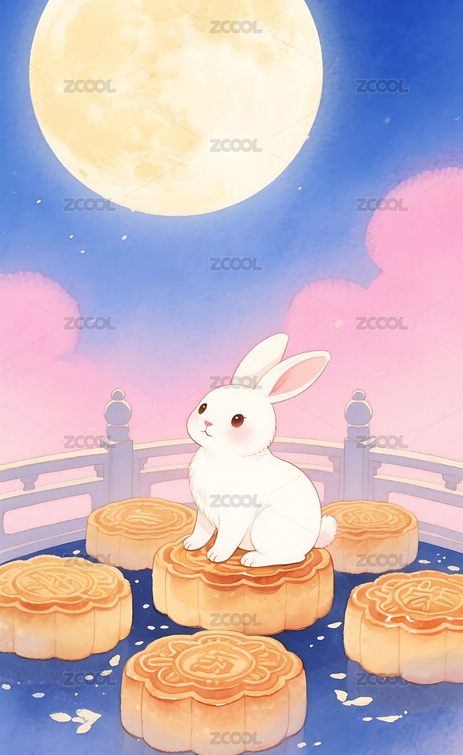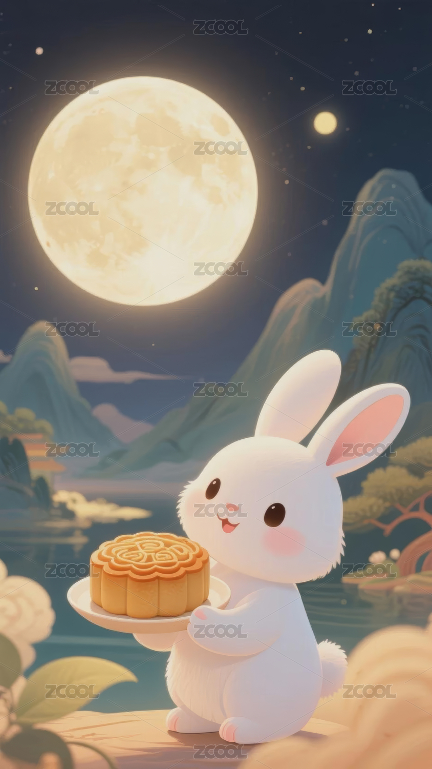 中秋满月捧着月饼的月兔