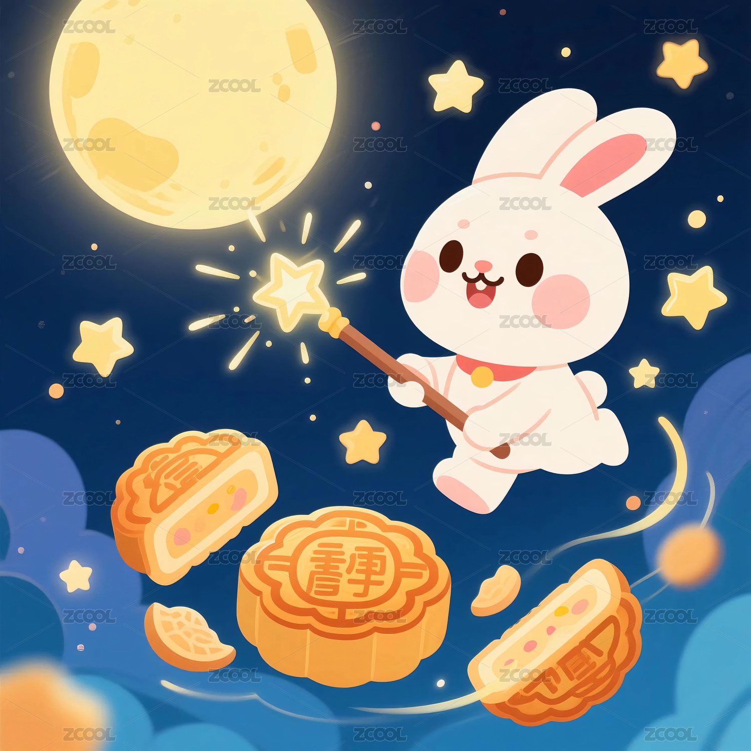 中秋节海报插画玉兔使用魔法棒变出月饼庆祝