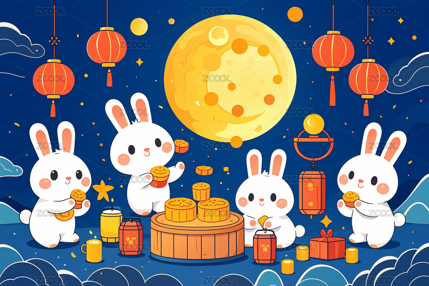 中秋,佳节,卡通风格,中国风,满月,祥云,传统,节日,团圆,寓意