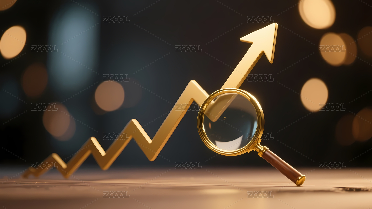 红色,金色,城市,天际线,图表,手,放大镜,上升,箭头,夕阳