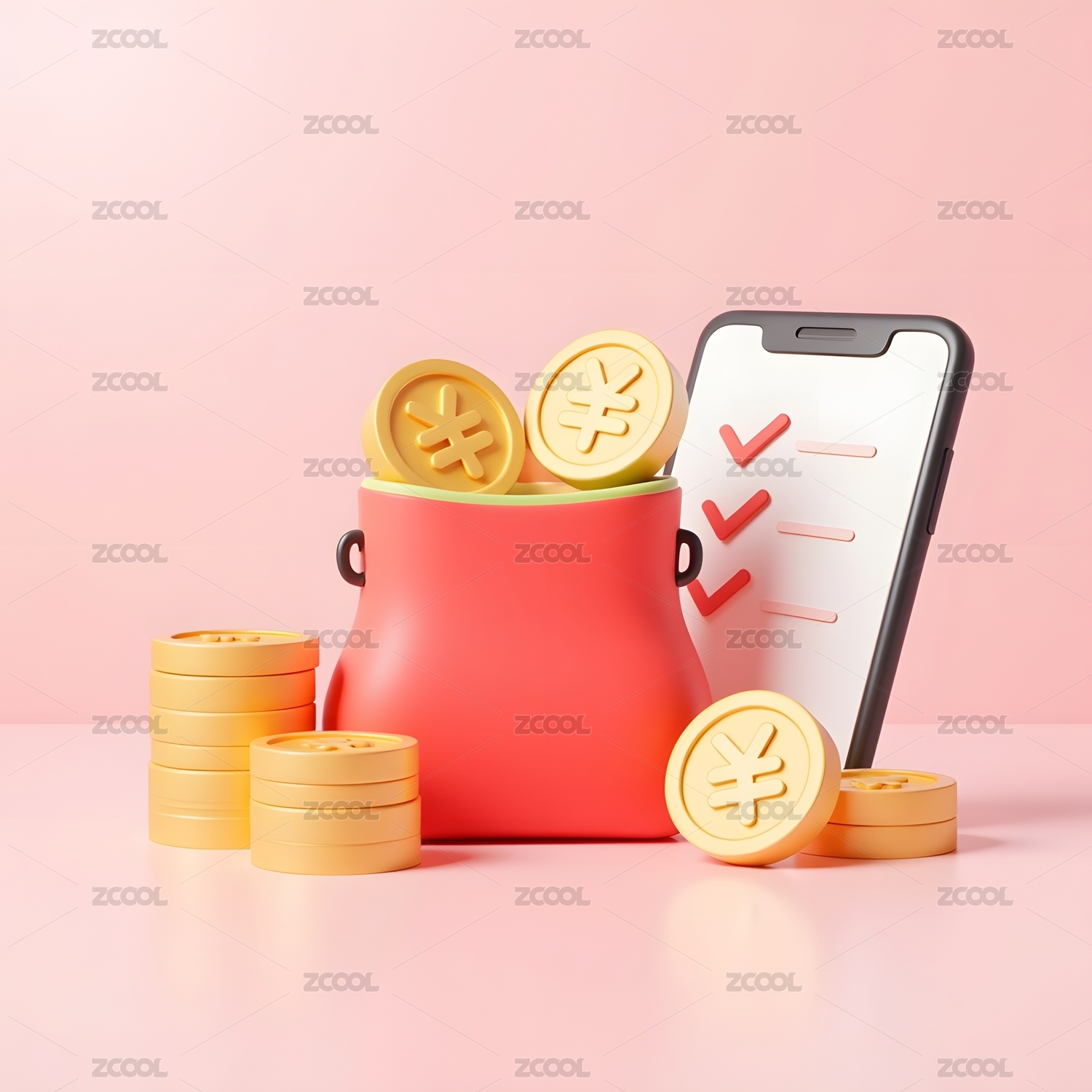 红色钱袋与金币手机支付