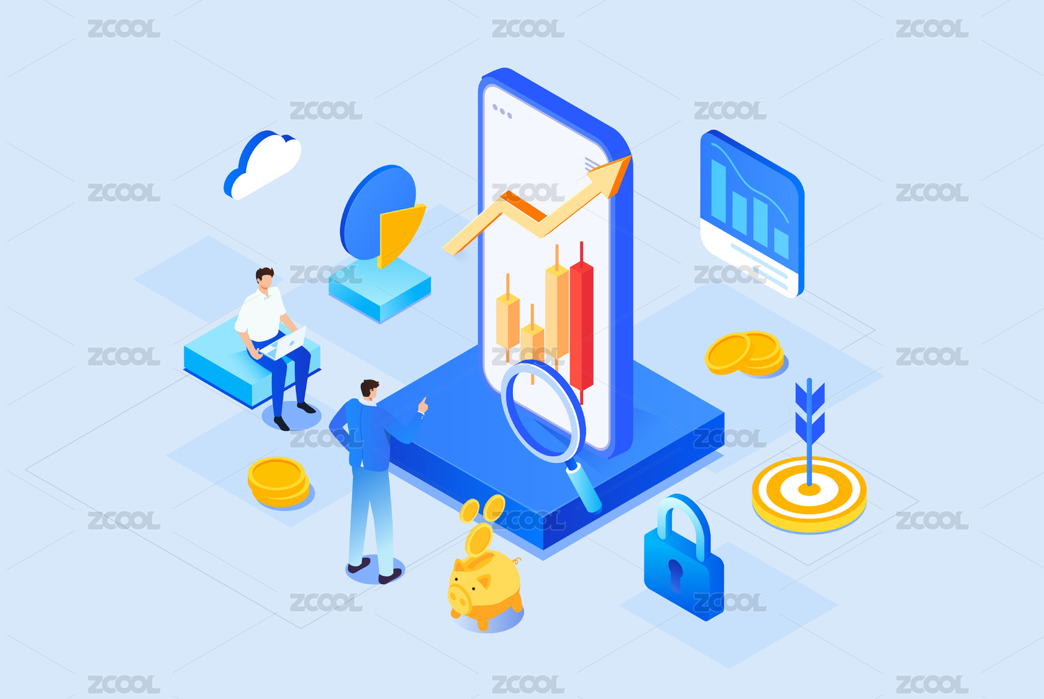 2.5D等距比特币互联网金融概念渐变矢量背景插画